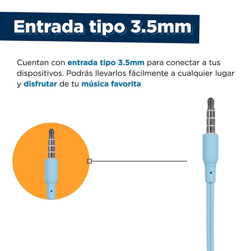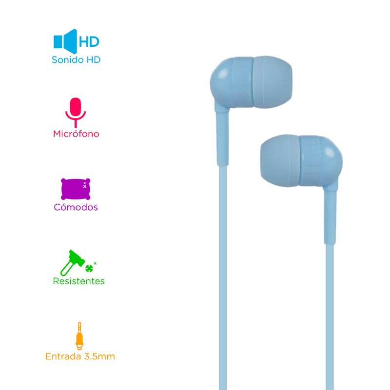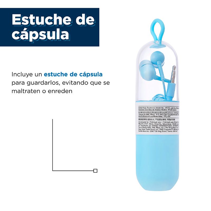 Audifonos De Cable, Con Estuche En Forma De Capsula, Pequeños, Azul Claro Audífonos de cable. | Color azul. | Incluye estuche para guardarlos. | Modelo HF236. Conéctalos a tu dispositivo y disfruta tu música favorita.
