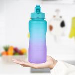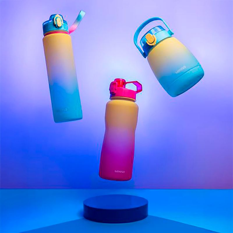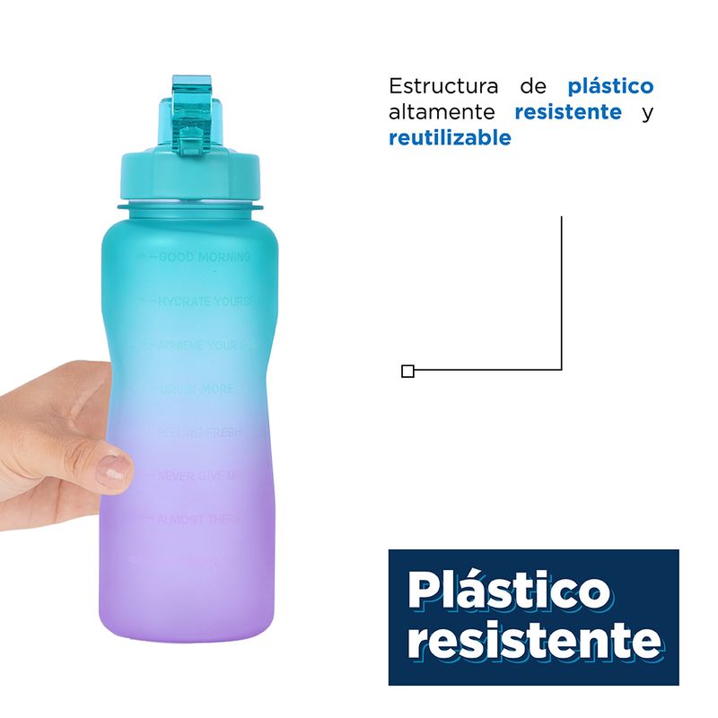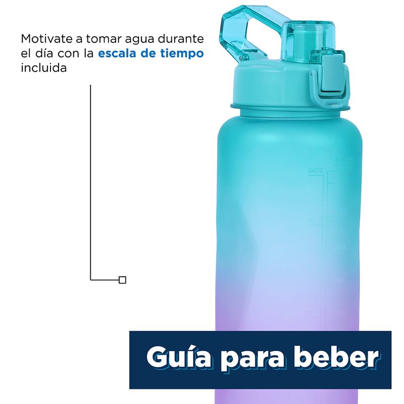 Adquiere este Botella de gran capacidad en tonalidades degradadas ¡Perfecto para el gimnasio, la escuela o el trabajo! | Elaborado en plástico de grado alimentico libre de BPA. | Capacidad 2 litros. | Diseñado con tapa enroscable con anillo de sellado en silicona, broche en tapa que abre de manera automática y detalle de capacidad en mililitros y onzas para medir las cantidades de agua y agregar suplementos en ella. | ¡Mantente hidratado y disfruta de tus bebidas favoritas a donde quiera que vayas con este Botella que tenemos para ti!. Instrucciones de uso: