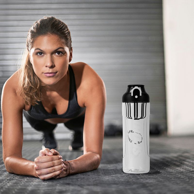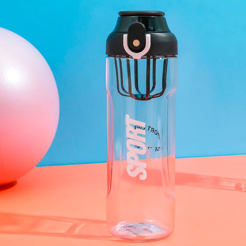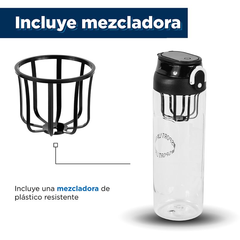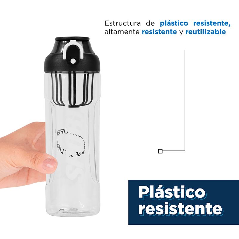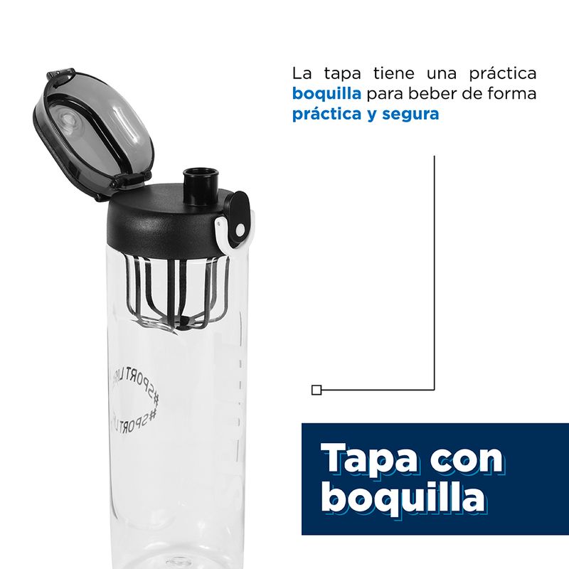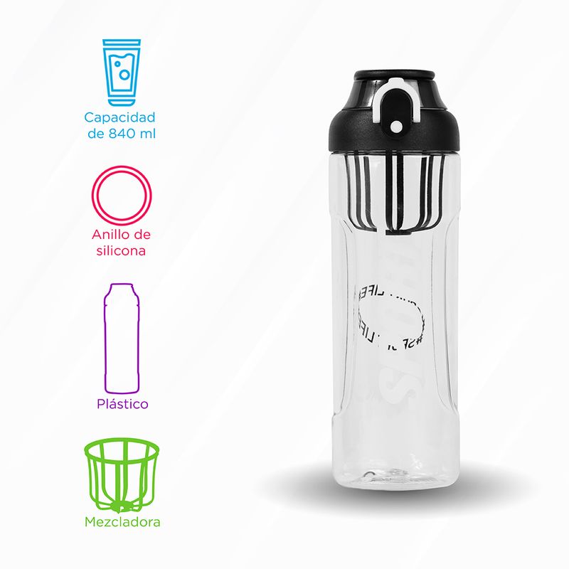 Botella De Platico Con Anillo Mezclador Negro 840 Ml, Cilindro de plástico deportivo con detalles estampados a contraste. | Con tapa de seguridad para evitar derrames. | Colador para poder realizar infusiones. | Capacidad de 840 ml. | Mantente hidratado y realiza las mejores infusiones para un mayor rendimiento en tus actividades deportivas. Instrucciones de uso: