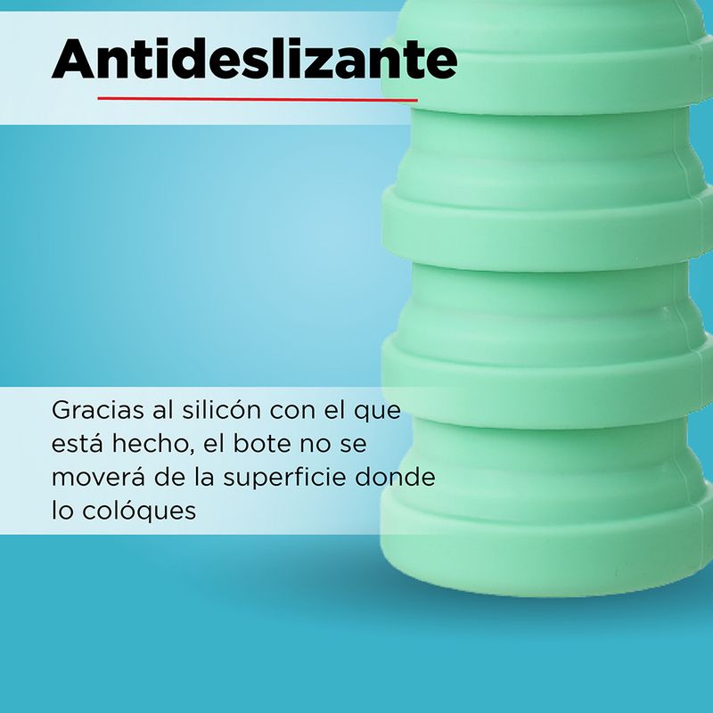 Botella plegable color verde con tapa. | Elaborada en silicona de grado alimenticio. | Su diseño te permite plegarla volviéndola completamente portátil y fácil de transportar. | Detalle de aro colgante en tapa. | Capacidad 470 ml. Instrucciones de uso:Abra el producto y antes del primer uso lave con jabón neutro. Vierta la bebida a almacenar y cierre. Precauciones y advertencias:Abra el producto y antes del primer uso lave con jabón neutro. Vierta la bebida a almacenar y cierre. Temperatura adecuada: 0 ? - 50 ?. No apto para uso en microondas, lavavajillas ni hornos. Mantenlo fuera del alcance de los niños para evitar peligros. Cuando coloque tabletas efervescentes o bebidas carbonatadas en la botella, que producirán gas, no coloque la tapa ni agite el cuerpo de la botella para evitar una explosión debido a la presión excesiva dentro de la botella. No transporte líquidos corrosivos.Guardar en lugar fresco y seco.
