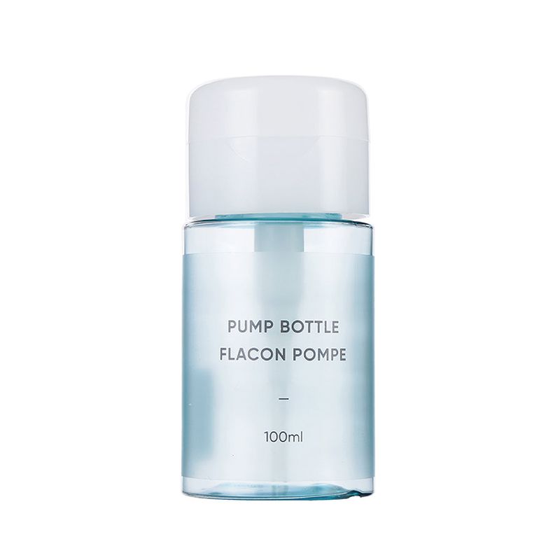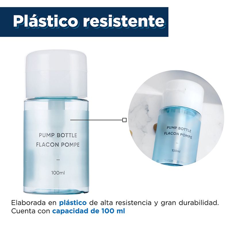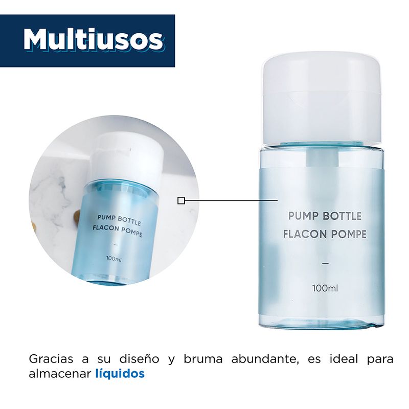 Botella de viaje dispensadora 100 ml. Diseño portátil, ideal para almacenar productos de cuidado personal.