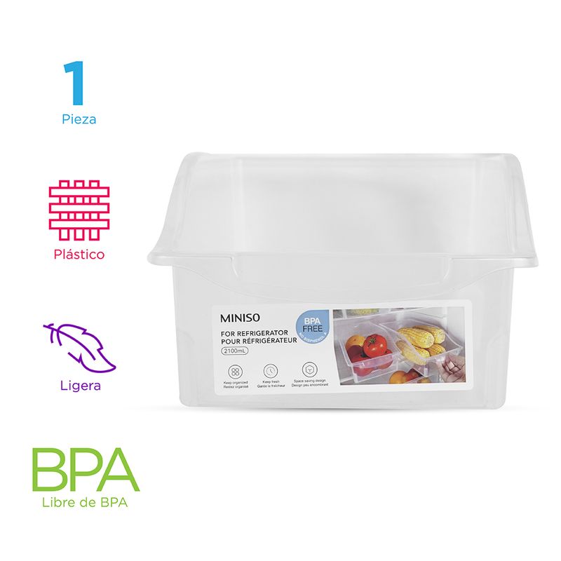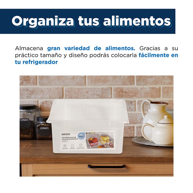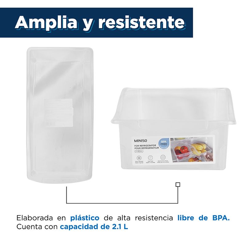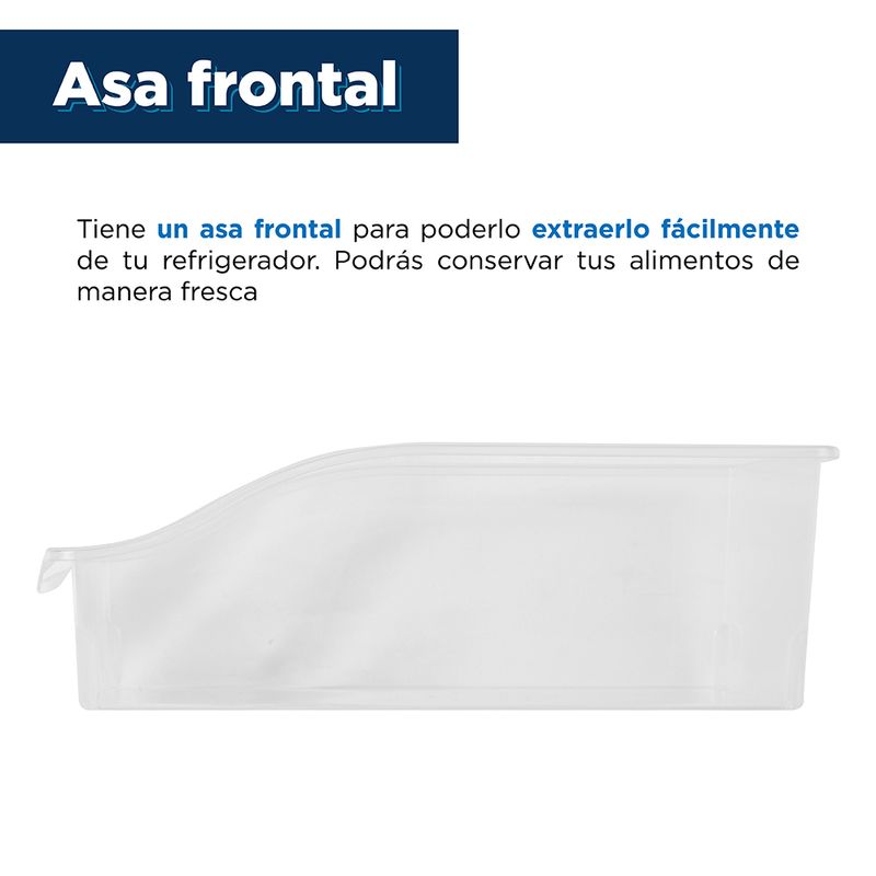 Caja de almacenamiento en color blanco. | Elaborada en plástico de alta resistencia y durabilidad. | Capacidad 1200 ml. | Forma rectangular con detalle de asa en parte frontal. | Ideal para almacenar todo tipo de alimentos en tu refrigerador. Modo de uso: