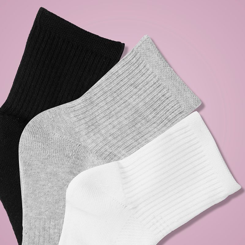 Miniso tiene para ti este set de calcetines deportivos para mujer ¡Perfectos para el día a día! | Confeccionados en tejido antibacterial; ayuda a evitar el mal olor, elimina el escozor y los hongos que provocan el pie de atleta, gracias a su tejido absorbe la humedad manteniendo tus pies secos en todo momento, funcionales para uso deportivo. | Talla 23-25. | Contiene 3 pares; negros, grises y blancos. | ¡Ya sea para hacer deporte o para estar en casa u oficina disfruta de la comodidad que estas propiedades inteligentes generan en tus pies! Modo de uso: Calcetín para mujer. Precauciones: Mantener alejado del fuego. Mantener fuera del alcance de los niños