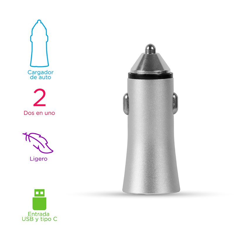 Cargador Plateado 6.5 Cm 20 W 20W Puerto Cargador de Automovil Rapido Modelo Usb y Tipo C: Sc310 Color Plateado