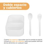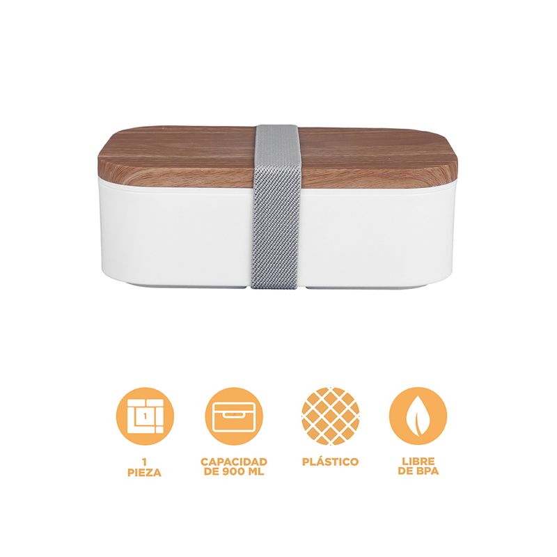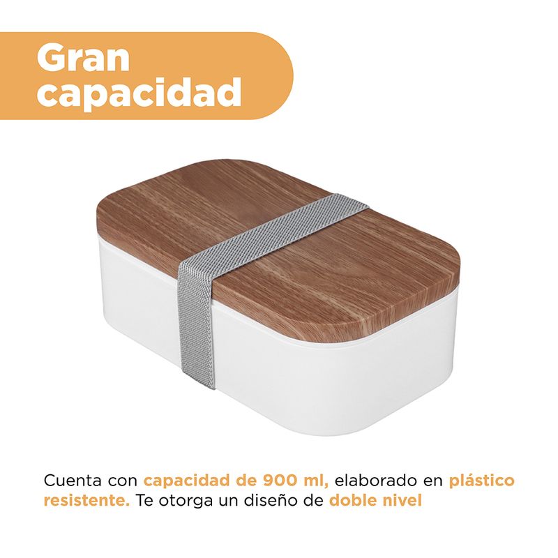 Miniso tiene para ti este practico contenedor de alimentos ¡Perfecto para la escuela o el trabajo! | Elaborado en plástico de alta resistencia de grado alimenticio libre de BPA. | Capacidad 900 ml. | Te otorga diseño con doble tapa; tapa superior con acabado tipo madera con detalle de cinta elástica y tapa ajustable con anillo de sellado en silicona que te proporciona un cerrado mas hermético libre de fugas. Incluye cuchara, tenedor y separador. | Gracias a su capacidad, podrás guardar y transportar gran variedad de alimentos de manera práctica y cómoda. Instrucciones de uso: