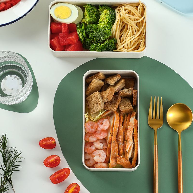 Llévate este contenedor de alimentos doble con cubiertos. | Esta elaborado en fibra de paja de trigo. | Tiene una capacidad de 1000 ml. | Te brinda un gran espacio de almacenamiento gracias a su diseño doble que te otorga separación. | El contenedor ideal para almacenar tus comidas para la escuela o la oficina. Instrucciones de uso: