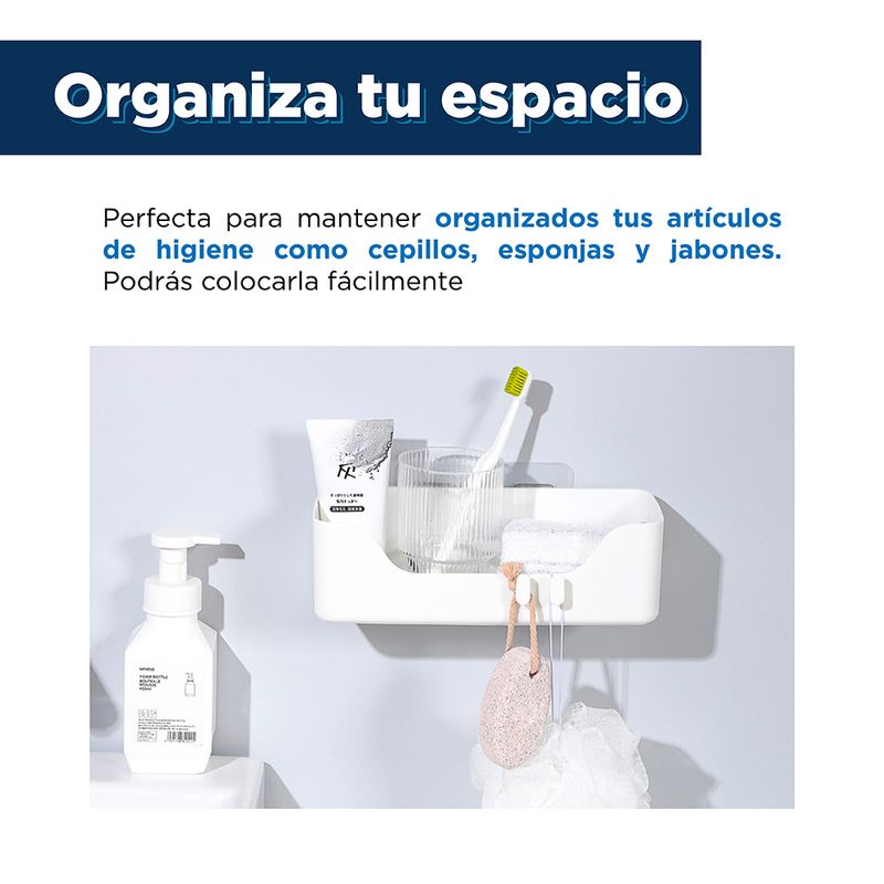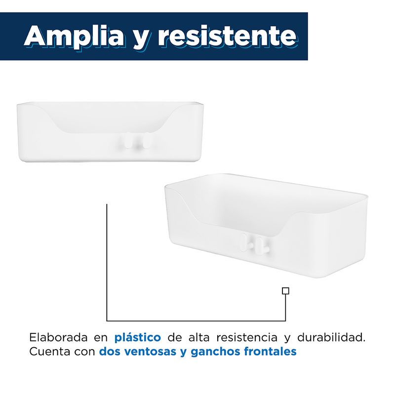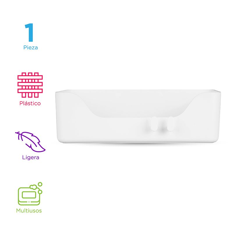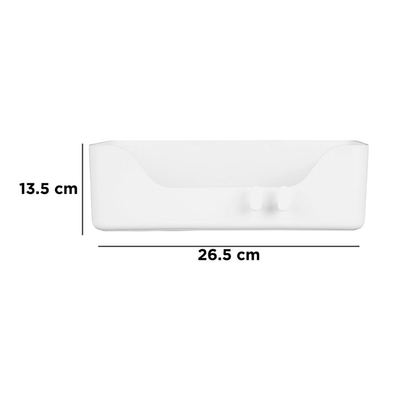 Contenedor Largo Para Baño Diseño sencillo y práctico. | Ideal para ahorrar espacio. | Se pega a las superficies. | Incluye las láminas con pegamento. | Color blanco. Modo de uso: