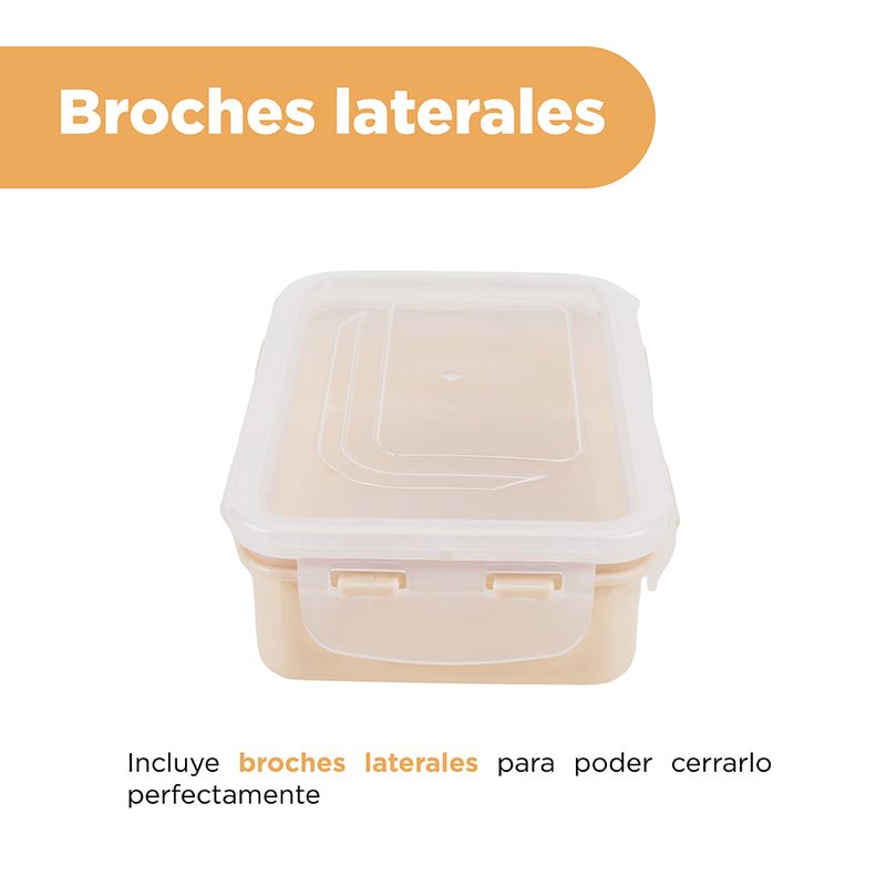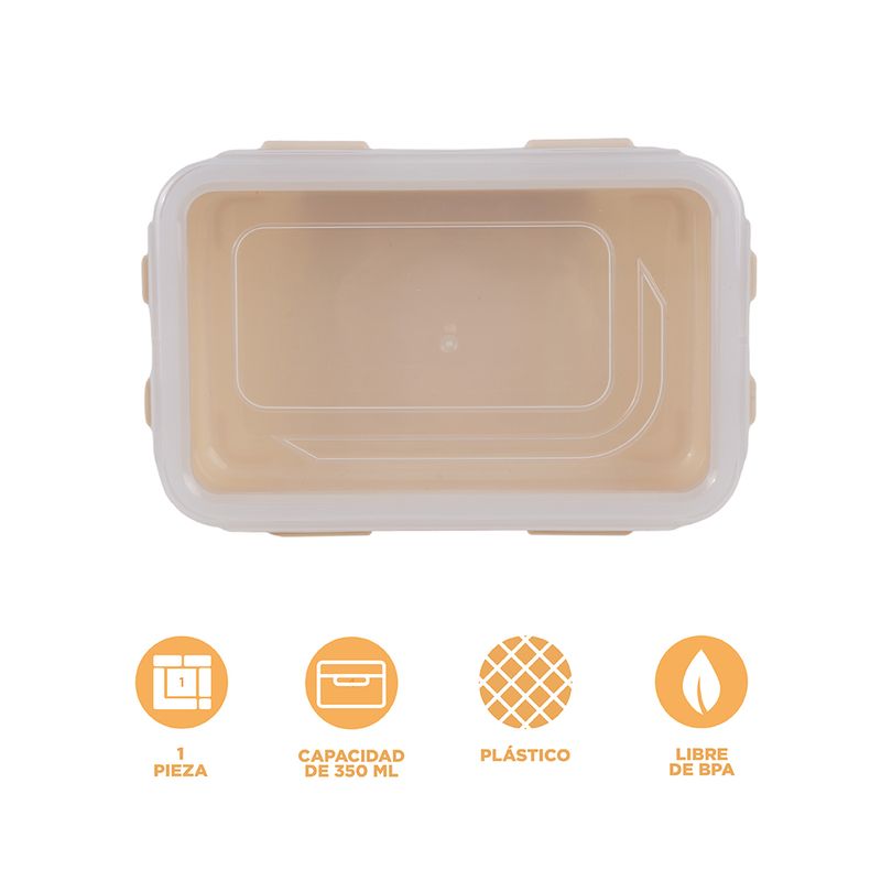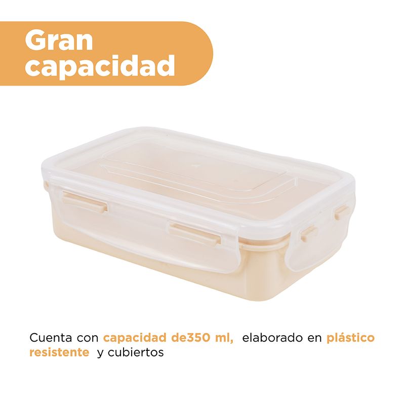 Contenedro Rectangular De Plastico, Para Comida 350Ml, Mediano, Beige Blanco. Guarda en él tus platillos favoritos. Resguarda tus comidas conservando por más tiempo su sabor, y guárdalas dentro de este práctico Contenedor Para Alimentos Rectangular Plástico Blanco 350 ml que Miniso tiene para ti. Es un recipiente con tapa que evita la salida o derrame de la comida, es pequeño, ligero y seguro. Está hecho con material de calidad que no altera en lo absoluto el sabor de los alimentos. Ideal para llevar comida a la escuela o trabajo. | Brinda protección: No dejes la comida del día expuesta a la intemperie, guárdala en este recipiente, es una opción perfecta para proteger los alimentos y mantenerlos refrigerados y en buen estado. | Práctico: Este recipiente de cocina es perfecto para almacenar comida caliente o fría. Su material resistente permite usarlo tanto en microondas como en refrigerador, manteniendo su sabor sin alterarlo. | Portátil: Puedes almacenar cualquier tipo de alimento en este práctico contenedor y llevarlo fuera de casa. Transpórtalo con total seguridad en tu lonchera, su tapa hermética evitará cualquier derrame de comida. | Diseño: Este recipiente cuenta con un diseño simple pero efectivo. Guarda en él tus platillos favoritos. Modo de uso: Puede calentar en un horno de microondas después de quitar la tapa. Temperatura adecuada: -20 ? -120 ? Precauciones: Producto de plástico mantener alejado del fuego. Los niños lo deben usar bajo la supervisión de un adulto.