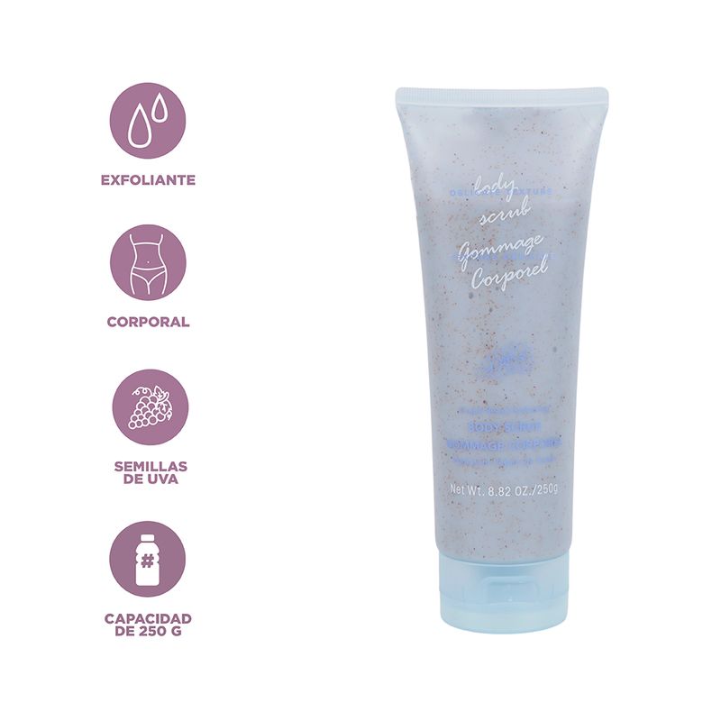 Miniso tiene para ti este exfoliante corporal de uva. | Contiene 250 gramos. | Te otorga un exquisito aroma con una textura suave y gentil con tu piel. | Aplica en las áreas deseadas la cantidad adecuada y comienza a realizar ligeros masajes en forma circular, posteriormente enjuaga con abundante agua. | Este exfoliante te deja un dulce aroma en la piel y una textura tersa. Certificado INVIMA: