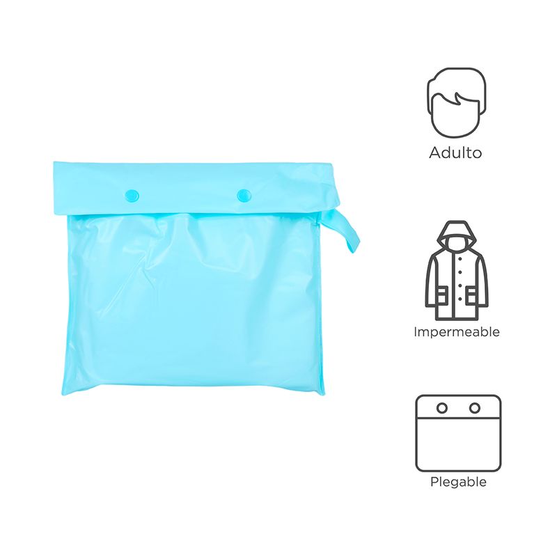 Adquiere este impermeable para adulto en color azul. | Viene en una practica bolsa de plástico con asa en costado. | Esta elaborado en materiales de vinil y acetato. | Las medidas del abrigo son: 1.10 m largo, largo de mangas 76 cm, ancho 63 cm, gorro 33 cm. | Mantente protegido a donde quiera que vayas con este practico impermeable que Miniso tiene para ti. Instrucciones de uso: