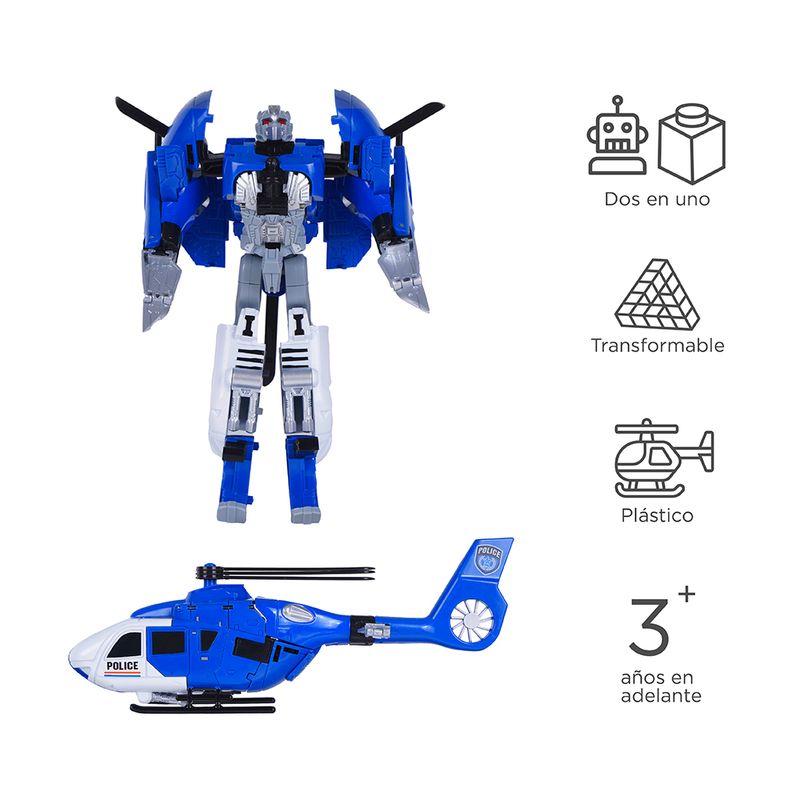 Llévate este juguete armable de helicóptero tiene un tamaño aproximado de 16x7 cm. | Tiene 2 formas de armado en helicóptero y muñeco tipo transformer. | Viene en forma de helicóptero para ser armado. | Incluye un manual de armado. | Un juguete entretenido e ideal para fomentar la capacidad de concentración y creatividad en los niños. ¡Adquiere toda la gama de vehículos armables que tenemos para ti!. Advertencias y precauciones: