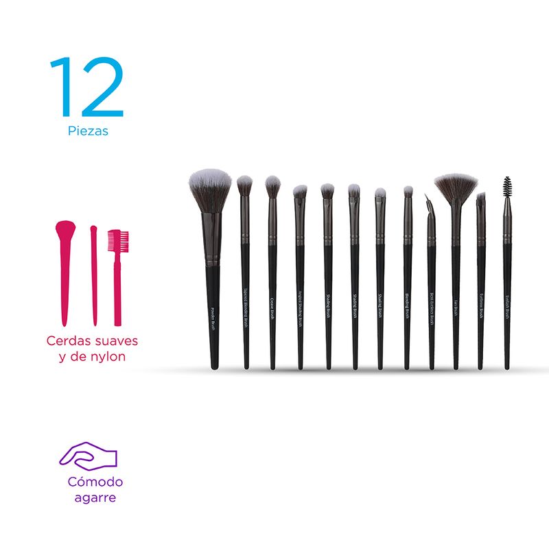 Kit Brochas Premium, De Maquillaje, Negro, 12 Pzas Cómodo set de 12 brochas para fines distintos. | Elegante y sencillo diseño. | Suaves al tacto. | Disponible en varios modelos. | Hechas de materiales premium, resistentes y duraderas. Instrucciones de uso: