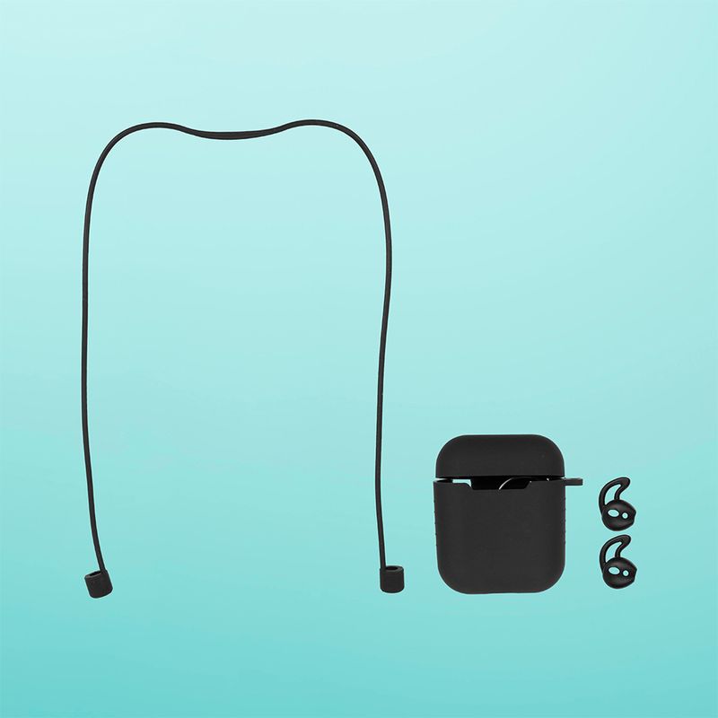 Miniso tiene para ti esta funda protectora para AirPods en color negro. | Elaborada en silicona de alta resistencia. | Incluye 2 protectores para AirPods, una correa para ajustarlos y detalle de gancho metálico para colgar. | Tamaño 6x6 cm. | Almacena y transporta de manera cómoda tus AirPods en este practico estuche. Instrucciones de uso: