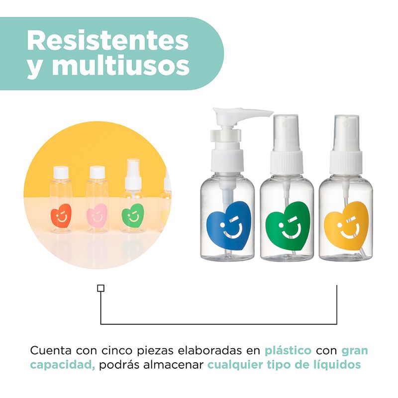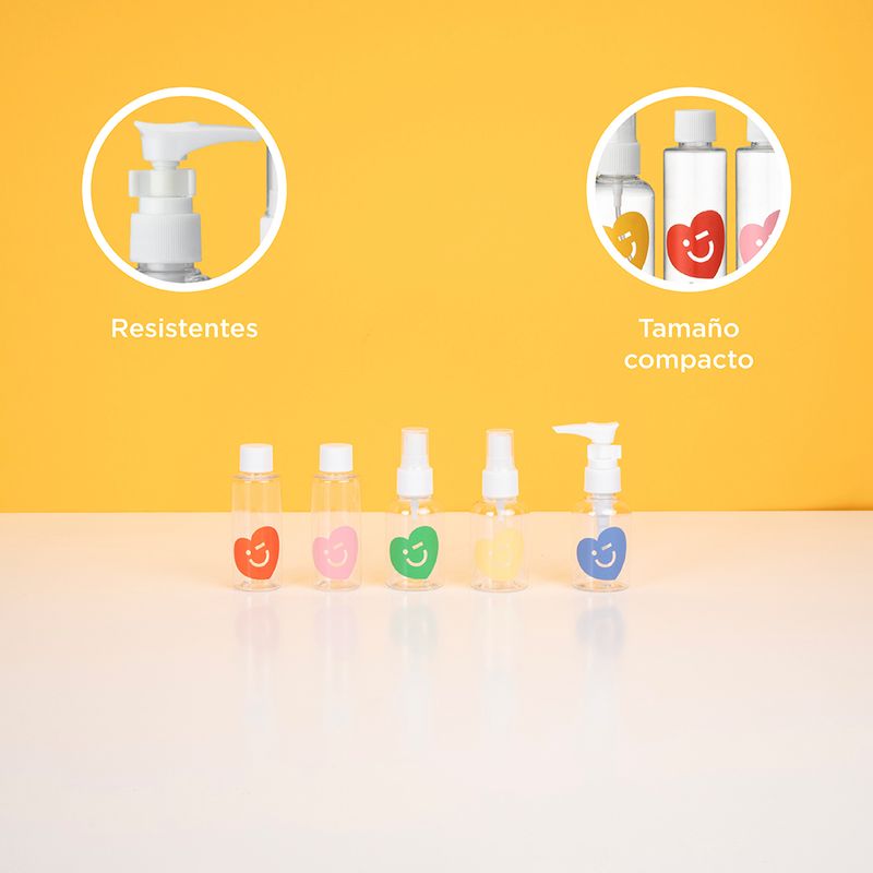 Miniso tiene para ti este practico kit de viaje de la colección Sweet Heart ¡Perfecto para llevarlo en tu equipaje de mano! | Elaboradas en plástico de alta resistencia y gran durabilidad. Contiene 1 botella con dispensador (tamaño 3.8x10.5 cm), 2 botellas con atomizador (tamaño 3.8x10 cm) y 2 botellas con tapa enroscable (tamaño 3x9.1 cm). | Diseñadas para almacenar gran variedad de productos de uso cosmético o de higiene personal, shampoos, cremas, acondicionadores, perfumes, fragancias, maquillaje y todo lo que necesites, el diseño de cada botella se permite ajustarse a todas tus necesidades. Incluye stickers. | Gracias a su tamaño compacto podrás llevarlas en tu equipaje de mano sin ocupar mayor espacio, vienen en una practica bolsa de plástico (tamaño 20.5x4x13.5 cm). | ¡El kit perfecto que no debe faltar en tus viajes! ¡Todo lo que necesitas solo lo encuentras aquí en Miniso! Modo de uso: Usar para almacenar y cargar artículos de tocador Precauciones: Evitar su roce con objetos duros y evitar la luz solar directa. Mantener lejos del fuego. No llenar sustancias con alta temperatura o alto valor de pH. Lavar con agua fría, no lavar con agua caliente. Mantener fuera del alcance de los niños