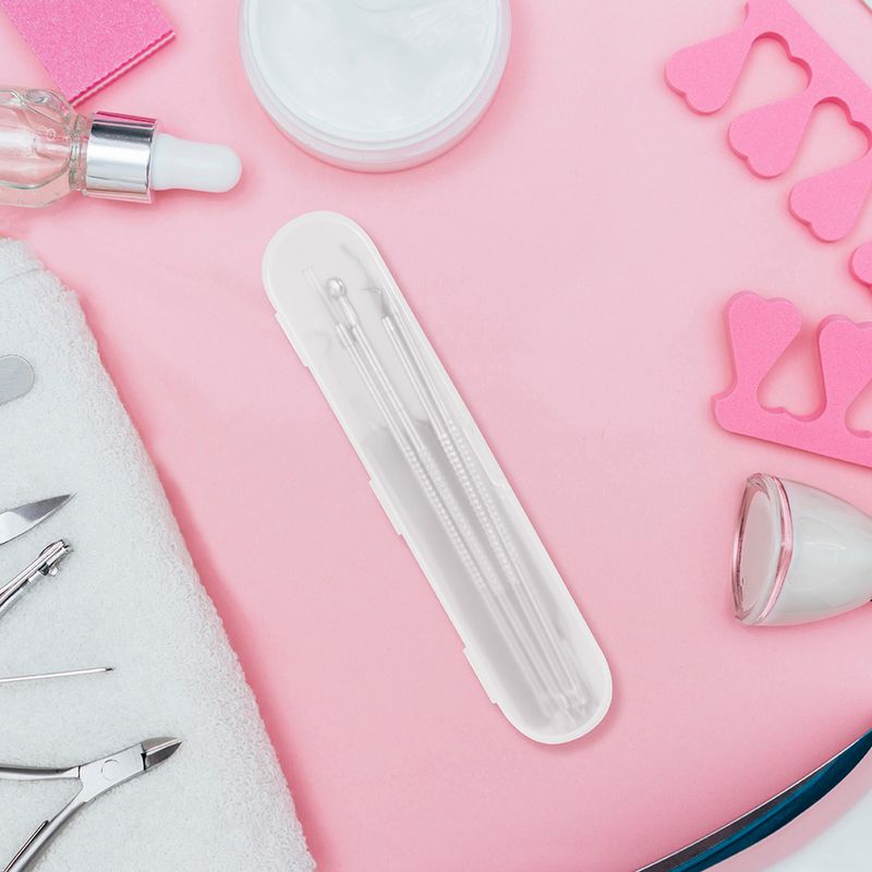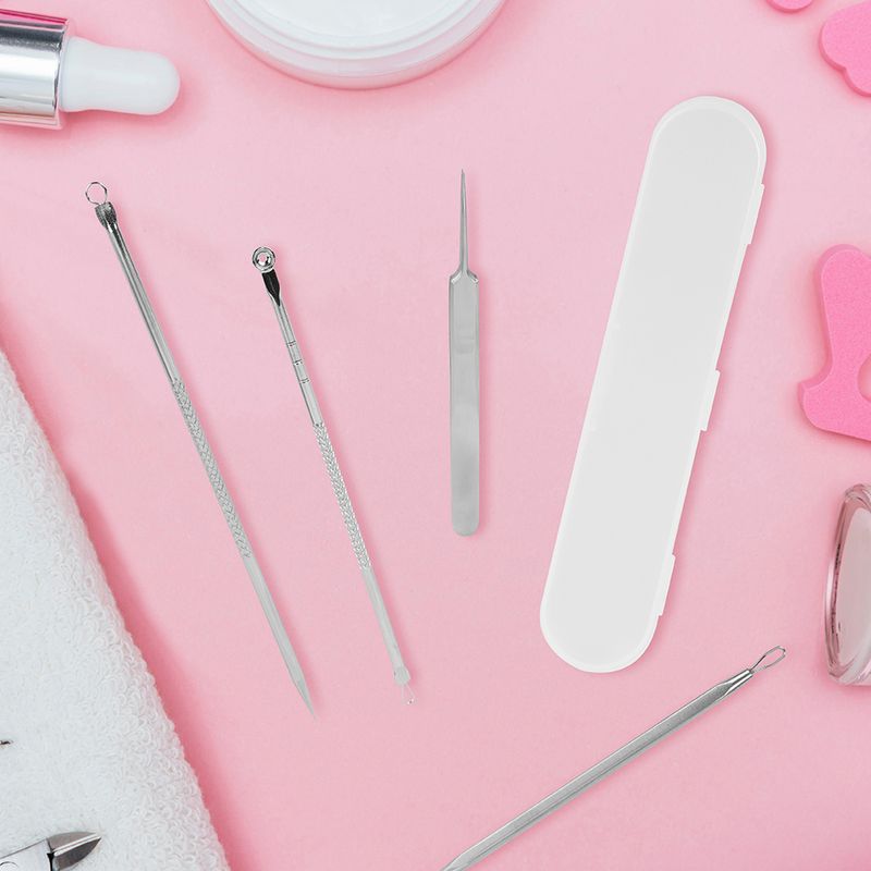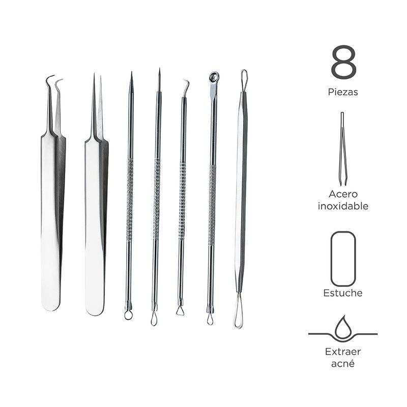 Kit removedor de acné en color plateado. | Con 8 piezas. | Elaborados en acero inoxidable. |Usa la aguja para perforar el grano, coloca el circulo de acero alrededor del área, presiona hacia abajo y desplaza lentamente. | Desinfecta el removedor de acné después de cada uso. Instrucciones de uso:
