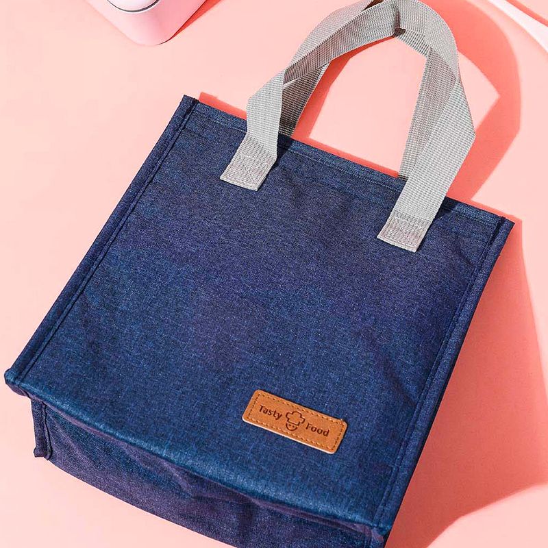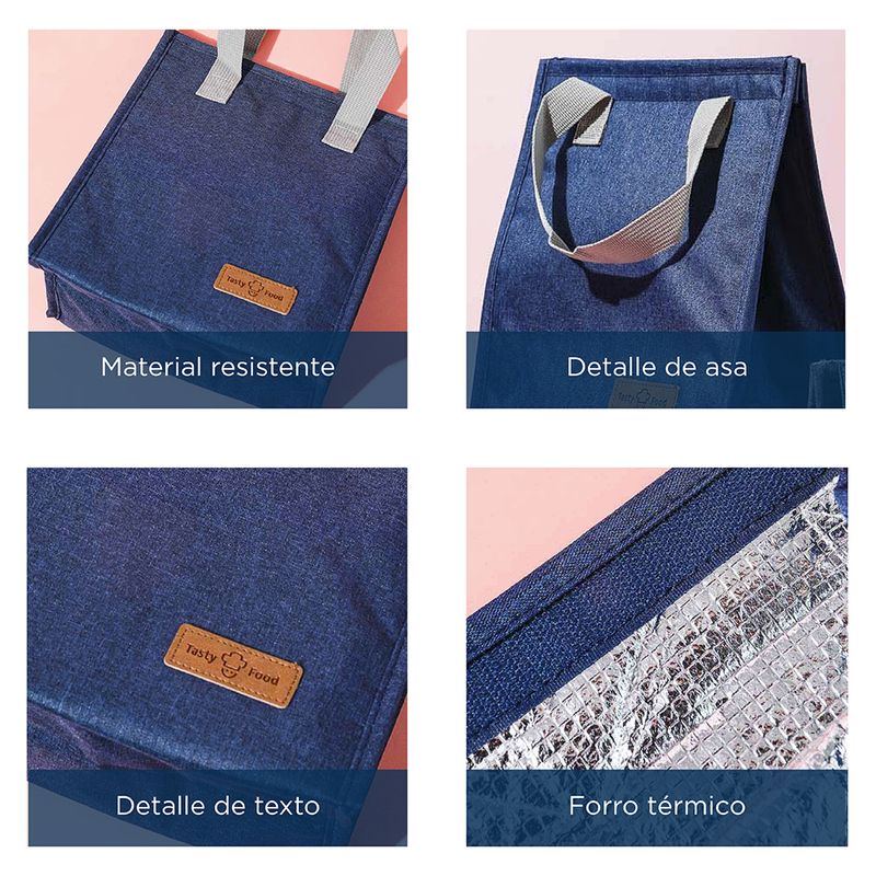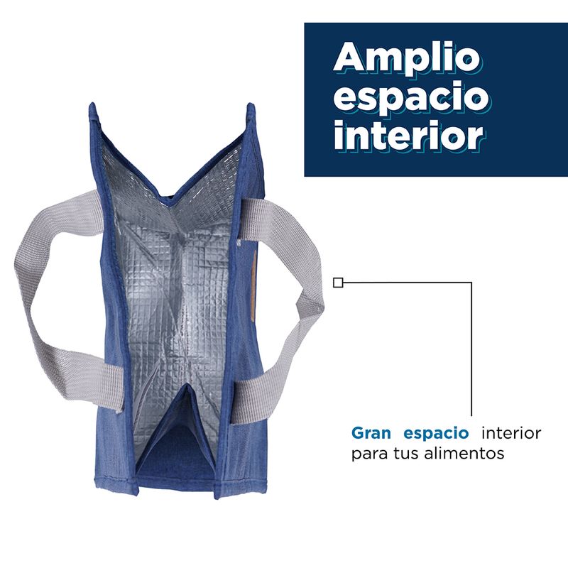 Bolsa de almuerzo en color azul. | Elaborada en materiales sintéticos de alta resistencia con forro térmico y doble asa suave. | Diseño textil tipo mezclilla. | Tamaño 23x13x26 cm. | Te ofrece gran portabilidad y un espacio ideal para transportar gran variedad de alimentos. Modo de uso: Introducir alimentos dentro para transportar cómodamente. Precauciones: Evitar arañazos o pinchazos con objetos duros. Evitar la luz solar directa por mucho tiempo. Los niños la deben usar bajo supervisión de un adulto