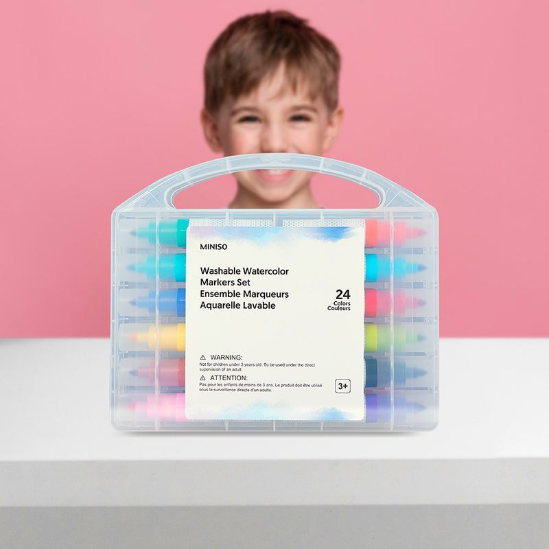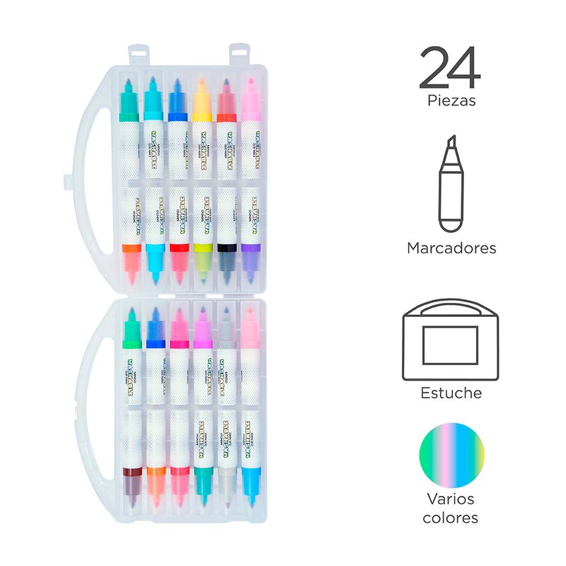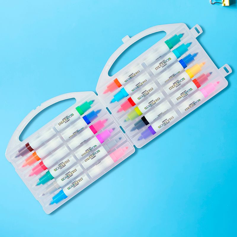 100% lavables. | 24 colores diferentes. | Hechos de materiales resistentes y duraderos. | Funcionales y prácticos. | Con estuche para que no se te pierda ninguno. Modo de uso: Ideales para pintar sobre lienzos Precauciones: No apto para niños menores de 3 años. Debe ser utilizado bajo la supervisión directa de un adulto. Mantener con la tapa para evitar deterioro.