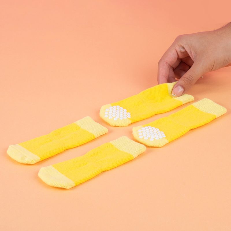 Miniso trae para ti estos prácticas medias para mascota ¡Perfectos para el frio o el cuidado de sus huellitas! | Confeccionados en tejido de punto con bordes elásticos. | Te otorgan un lindo diseño en tonalidad amarillo con gomitas antideslizantes ¡Ideales para que tu amiguito no sienta incomodidad o resbale al andar! | Tamaño 13x5.5 cm ¡Perfecto para mascotas grandes! | ¡Solo aquí encontraras los mejores accesorios para tus mascotas!.Modo de uso: