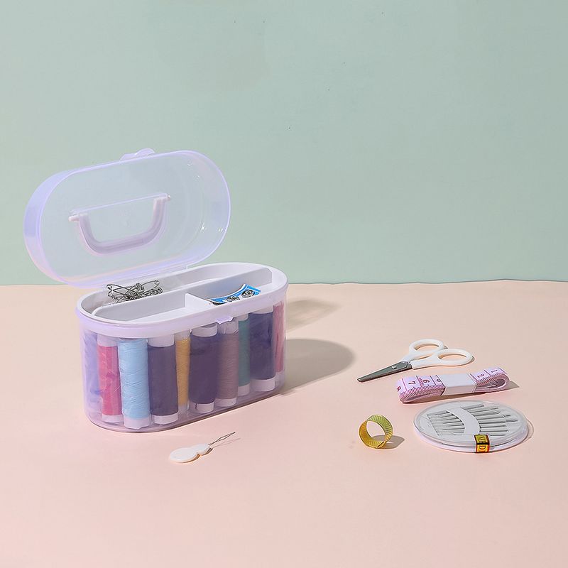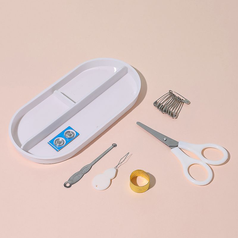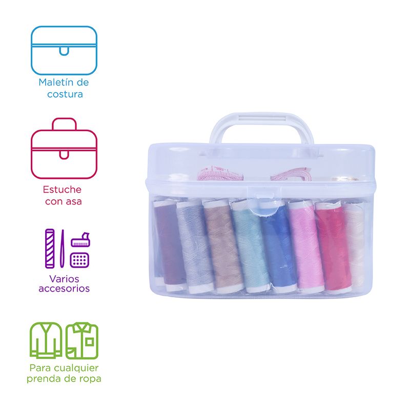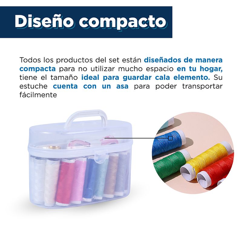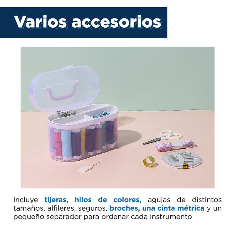 Características | Materiales o componentes: Tijeras (Plástico, acero inoxidable), hilo (poliéster), caja de agujas (acero, PS), dedal (acero de titanio), cinta métrica (Plutonio), broches (hierro), alfileres (hierro), caja de almacenamiento (Plástico) |