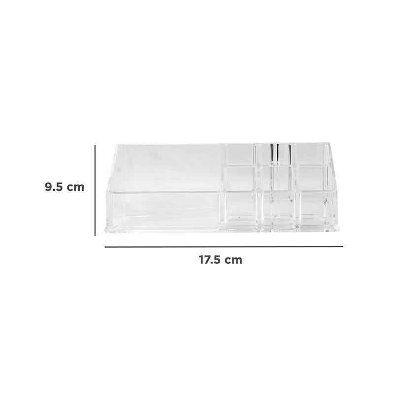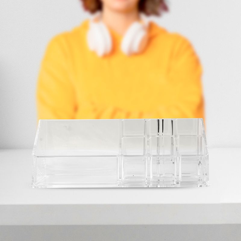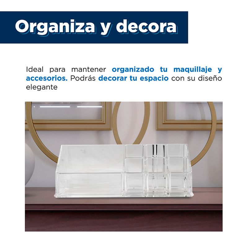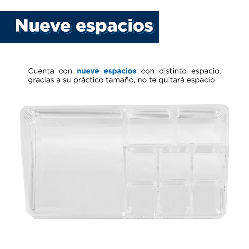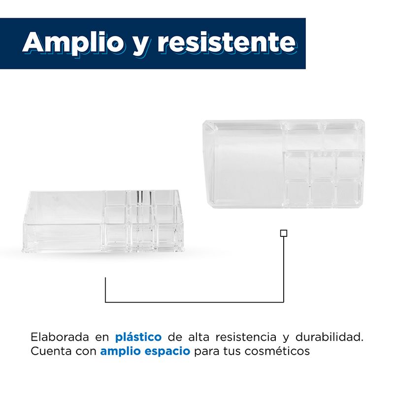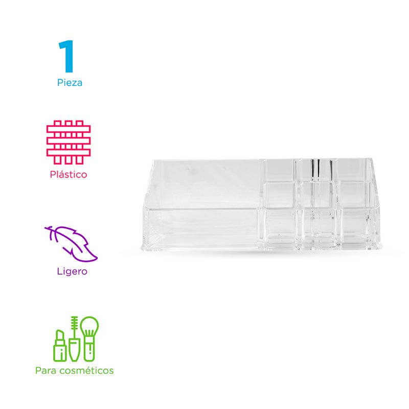 Compartimentos perfectos. Material transparente que permite ver el interior. Producto de moda y multifuncional. Con amplia gama de usos y aplicaciones. Modo de uso: Usar para guardar, organizar y proteger sus cosméticos. Precauciones: Mantener alejado del fuego. No dejar caer. Evitar la colisión y presión. Los niños lo deben usar bajo supervisión de un adulto.