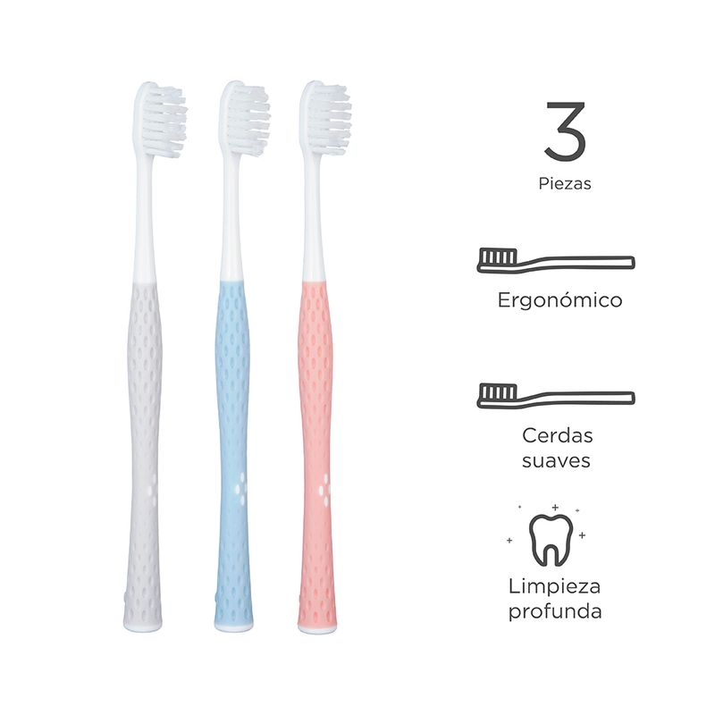 1. Las cerdas suaves y finas son eficaces para limpiar la superficie de los dientes y el área entre los dientes 2. Dar un masaje en la cavidad bucal 3. Ven con un cómodo mango antideslizante. Certificado INVIMA: