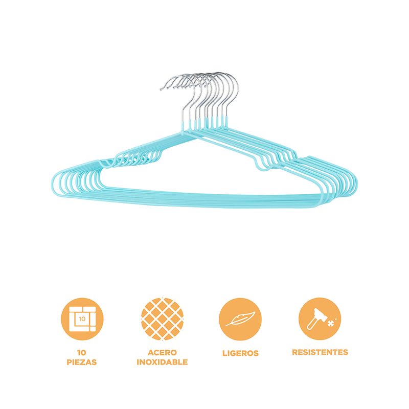 Olvídate del desorden dentro de tu clóset o ropero. Organiza y cuelga: camisas, pantalones, faldas, vestidos, trajes, chales, abrigos, playeras o cualquier prenda de tu elección con este paquete de ganchos. |Genera un mayor espacio en tu clóset: Al ser unos ganchos de diseño delgado y compacto, le darás un nuevo aspecto a tu guardarropa al liberar espacio de él teniendo un mayor control de tus prendas y un mayor margen de maniobra dentro de tu armario. |Olvídate del desorden: Dile adiós a los ganchos de otros tamaños y formas. Unifica los ganchos de tu armario con el paquete de ganchos de Miniso, son prácticos y compactos haciendo que tus prendas se ajusten a ellos fácilmente. |Materiales resistentes: No se rompen fácilmente, además de ser amigables con el medio ambiente y no dejan manchas ni marcas en tu ropa. |Prácticos y portátiles: Llévalos incluso contigo cuando salgas de viaje para mantener en perfecto estado tu ropa en esos viajes de trabajo o en tus vacaciones. Modo de uso: Usar para todo tipo de ropa. Precauciones: Mantener alejado del fuego. Mantener alejado de los niños.