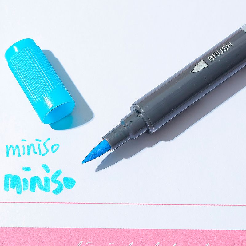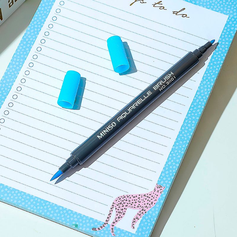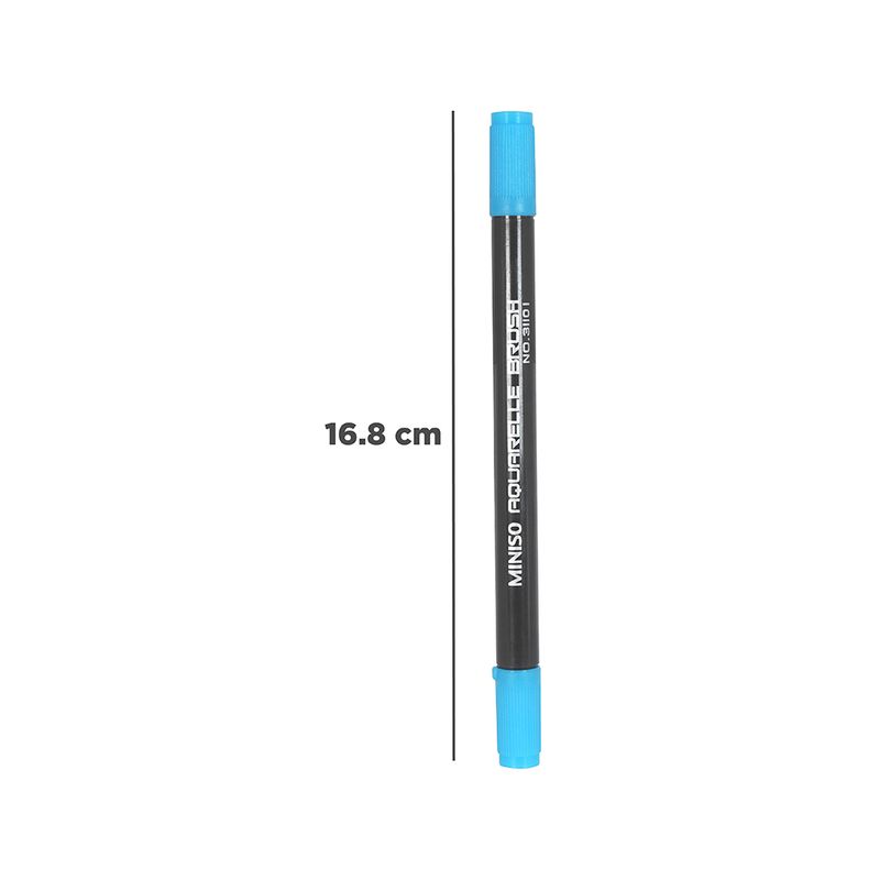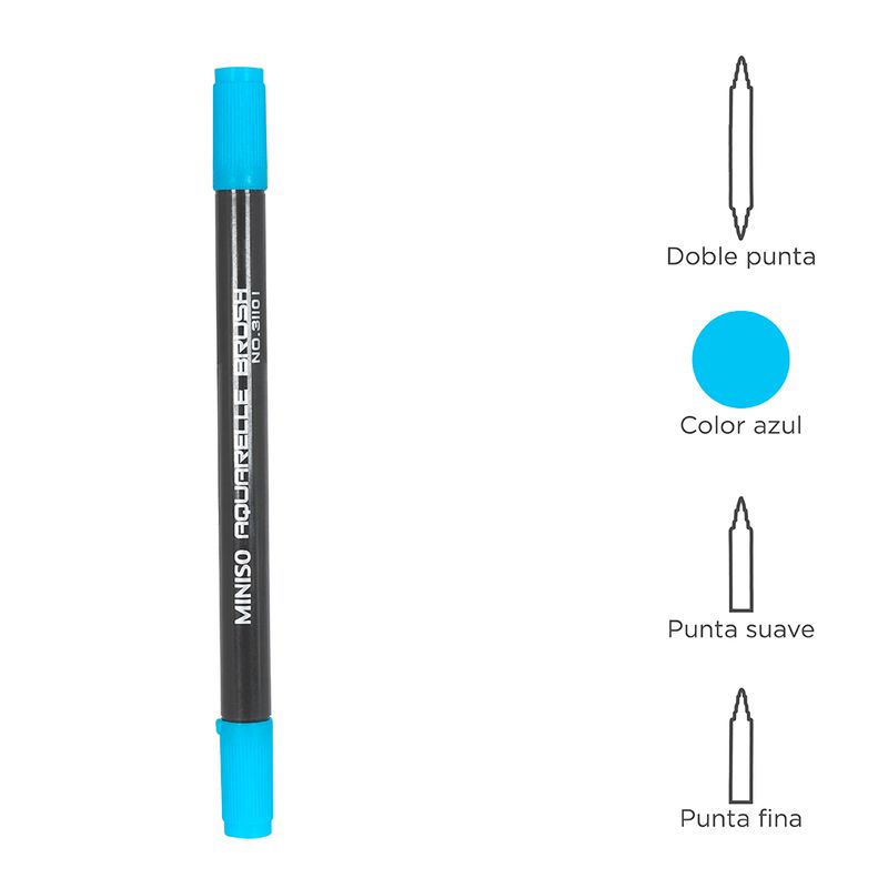 Resalta y da color a tus escritos y textos con este Plumón De Acuarela Doble Punta Azul que Miniso tiene para ti. Este bolígrafo cuenta con dos cabezales, cualidad que brinda mayor duración al producto. Es delgado, ligero, de uso sencillo, de escritura suave en papel, fácil de guardar en la mochila o lapicera y, además, su tinta es soluble en agua. Es ideal para usar en la escuela o en la oficina. |Calidad: La pluma está hecha con materiales no tóxicos, además, es eficaz, está formulada con tinta de calidad para una escritura suave y brinda un color uniforme en cada trazo. |Un lindo obsequio: Tenemos una opción de regalo perfecta para sorprender a esa persona especial, esta original pluma es un lindo detalle que le encantará a niños, familiares y amigos. |Material de fabricación: La pluma está hecha con materiales de primera calidad, que brindan máximo rendimiento y garantizan mayor duración del producto. Sus materiales resistentes permiten un agarre más firme. |Diseño: Cuenta con un diseño espectacular de fácil y cómodo agarre para escribir sobre cualquier superficie. Modo de uso: Escribir sobre una superficie lisa. Precauciones: Mantener alejado del fuego. No dejar caer. No morder. Los niños lo deben usar bajo supervisión de un adulto.
