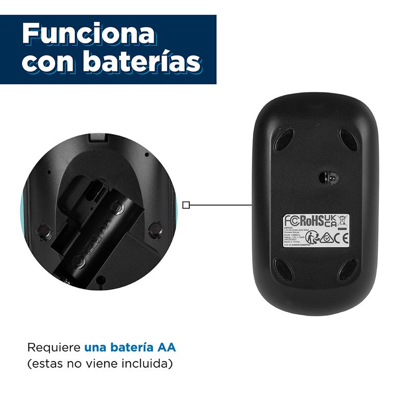 Destape el botón superior e instale 1 batería AA (No incluida) de acuerdo con la polaridad que se muestra en el mouse. Inserte el receptor y use el mouse después de unos segundos después de la instalación automática en la computadora.