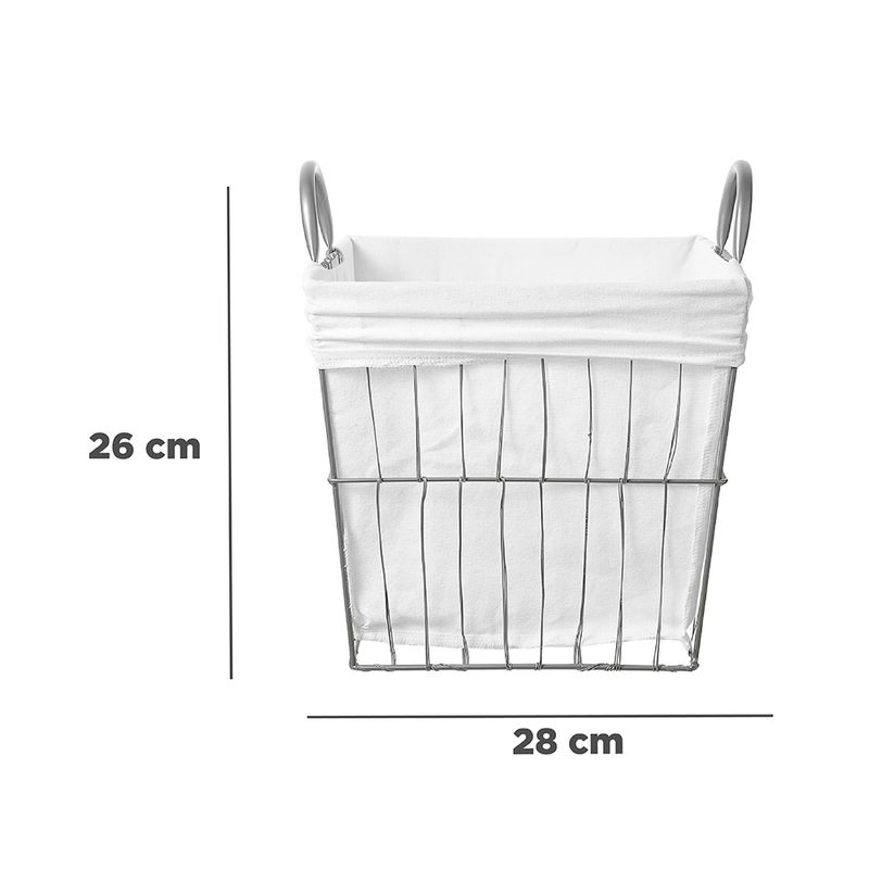 Adquiere esta cesta perfecta para almacenar y organizar diferentes artículos personales o del hogar. Ayuda a mantener tus espacios ordenados y organizados. | Tiene una estructura de hierro en forma de canastilla con detalle de asas en costados, forro textil confeccionado en algodón y poliéster. Su forro le otorga el soporte ideal para almacenar todo tipo de artículos, es ajustable puedes retirarlo cuando desees. Es una cesta duradera que te permitirá almacenar todo tipo de artículos. | Tiene un tamaño de 28x28x26 cm , te brinda un gran espacio para almacenar artículos gracias a su practico tamaño. No es solo un organizador del hogar, sino también un accesorio de decoración gracias a su lindo diseño y estructura. | Sirve para organizar artículos de dormitorio, baño, cocina, oficina, también es adecuado para organizar artículos en el armario o cualquier espacio en el que necesites almacenar objetos de todo tipo. Almacena diferentes cosas como dispositivos móviles, gafas, joyas, calcetines, cargadores, ropa interior entre muchos otros artículos de uso diario. | ¡El complemento perfecto para los amantes del orden y la limpieza!. Modo de uso: