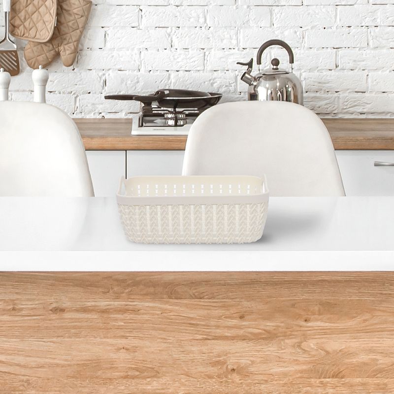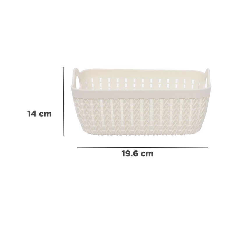 Miniso tiene para ti estas cestas de almacenamiento chicas en color blanco. | Elaboradas en plástico de alta resistencia. | Diseño entretejido con detalle de asas en costados. | Tamaño 19.6x14x8.5 cm. | Organiza tus espacios y utilízalo como un accesorio de decoración gracias a su lindo diseño y estructura. Modo de uso: