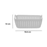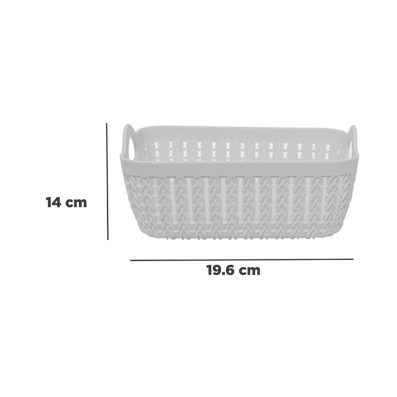 Miniso tiene para ti estas cestas de almacenamiento chicas en color gris. | Elaboradas en plástico de alta resistencia. | Diseño entretejido con detalle de asas en costados. | Tamaño 19.6x14x8.5 cm. | Organiza tus espacios y utilízalo como un accesorio de decoración gracias a su lindo diseño y estructura. Modo de uso: