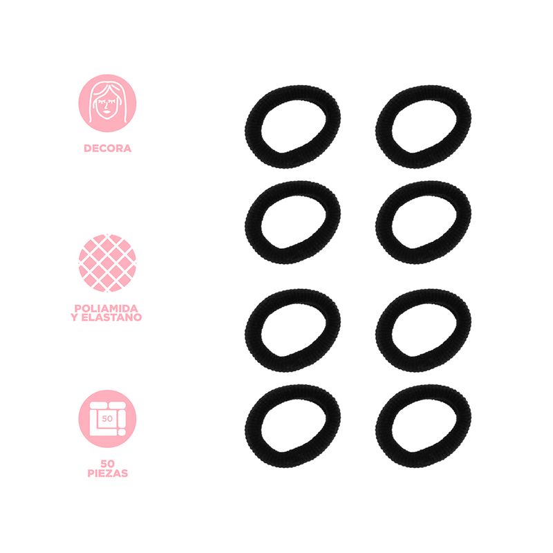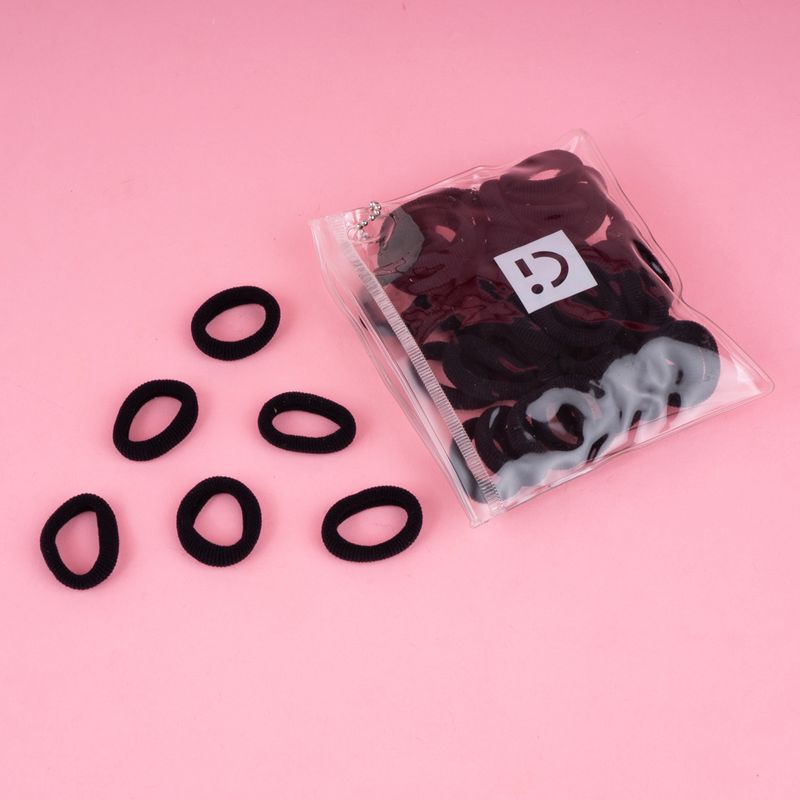 Miniso tiene para ti este paquete de ligas pequeñas para cabello color negro. | Elaboradas en materiales textiles. | Diseño plano y ancho. | Contiene 50 ligas. | Estas ligas son perfectas para todo tipo de peinados. Modo de uso: Sujetar el cabello. Precauciones: No forzar para no romper. Mantener alejada del fuego. Los niños la deben usar bajo supervisión de un adulto