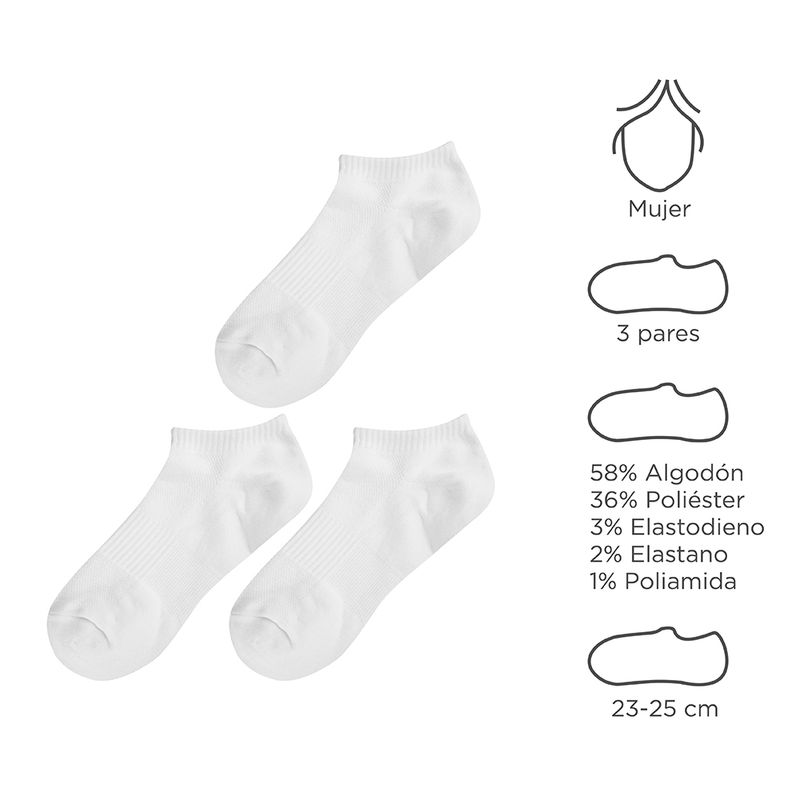 Cómodo paquete de 3 pares. | Corte bajo. | Cómodos de usar. | No dejan marcas. | Varios colores disponibles. Modo de uso: Calcetín para mujer. Precauciones: Mantener alejado del fuego. Mantener alejado de los niños.