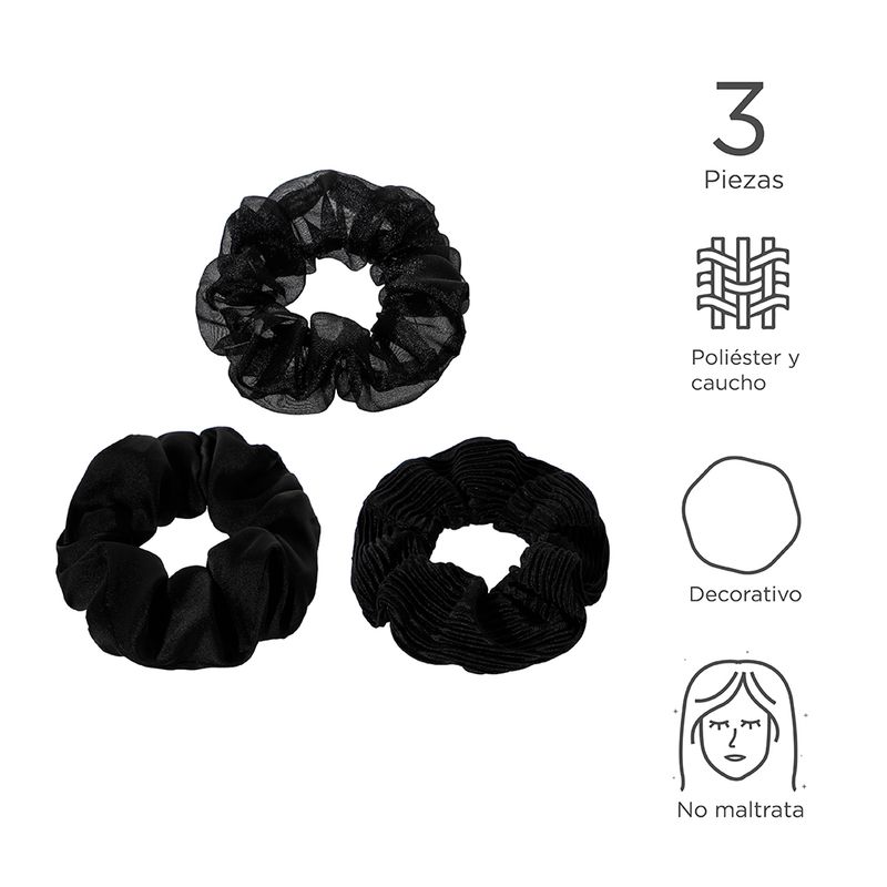 Con este de set de ligas que en realidad yo llamaría donas no comestibles. | Tu cabello podrá estar suavemente recogido. | Son de tamaño grande para que aun con una melena bella y abundante puedas sujetarlo sin problemas. | Vienen en tres diferentes diseños una con transparencia, otra con líneas a tono y otra mas con un diseño liso. Modo de uso: Sujetar el cabello. Precauciones: No forzar para no romper. Mantener alejada del fuego. Los niños la deben usar bajo supervisión de un adulto