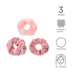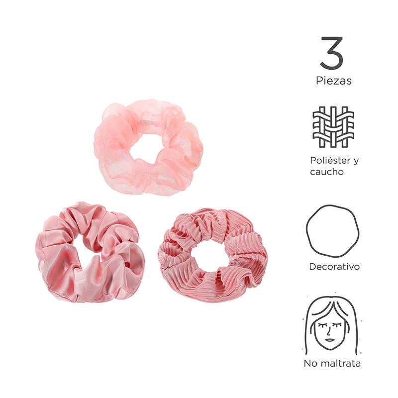Con este de set de ligas que en realidad yo llamaría donas no comestibles. | Tu cabello podrá estar suavemente recogido. | Son de tamaño grande para que aun con una melena bella y abundante puedas sujetarlo sin problemas. | Vienen en tres diferentes diseños una con transparencia, otra con líneas a tono y otra mas con un diseño liso. Modo de uso: Sujetar el cabello. Precauciones: No forzar para no romper. Mantener alejada del fuego. Los niños la deben usar bajo supervisión de un adulto