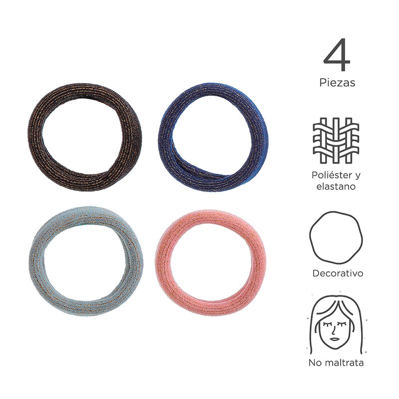 Amárrate el cabello y prueba nuevos looks con este Paquete De Ligas Para Cabello Estilo Europeo Multicolor 4 Piezas. | El cabello recogido es muy cómodo y se te verá el rostro completo. | Hechas con materiales elásticos de la más alta calidad. | Cómodo paquete con 4 piezas. | Con diseño europeo. Modo de uso: Sujetar el cabello. Precauciones: No forzar para no romper. Mantener alejada del fuego. Los niños la deben usar bajo supervisión de un adulto