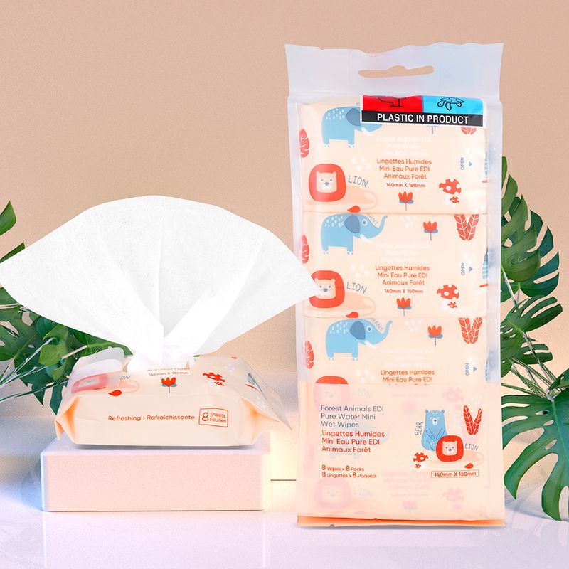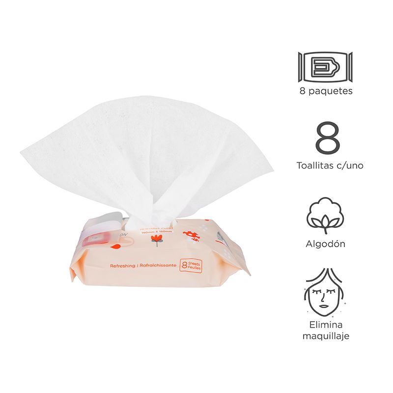Cómodo paquete de 8 mini toallas húmedas. | Libres de alcohol y agentes fluorescentes. | Hechas 100% de algodón. | Ideales para niños y adultos. | Colorido y practico paquete. Certificado Invima