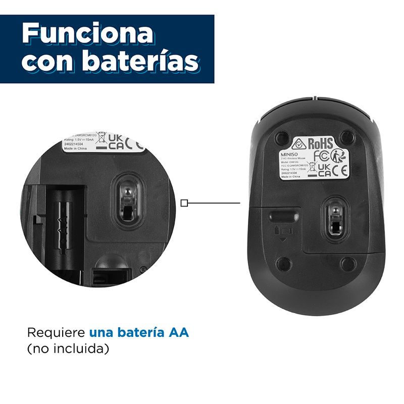 Empuje el compartimiento de la batería hacia abajo e instale 1 batería AA (No incluida) de acuerdo con la polaridad que se muestra en el mouse. Inserte el receptor y use el mouse después de unos segundos después de la instalación automática en la computadora.