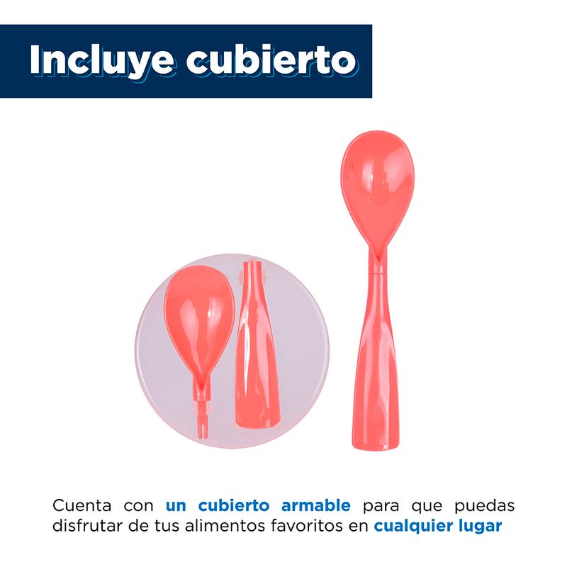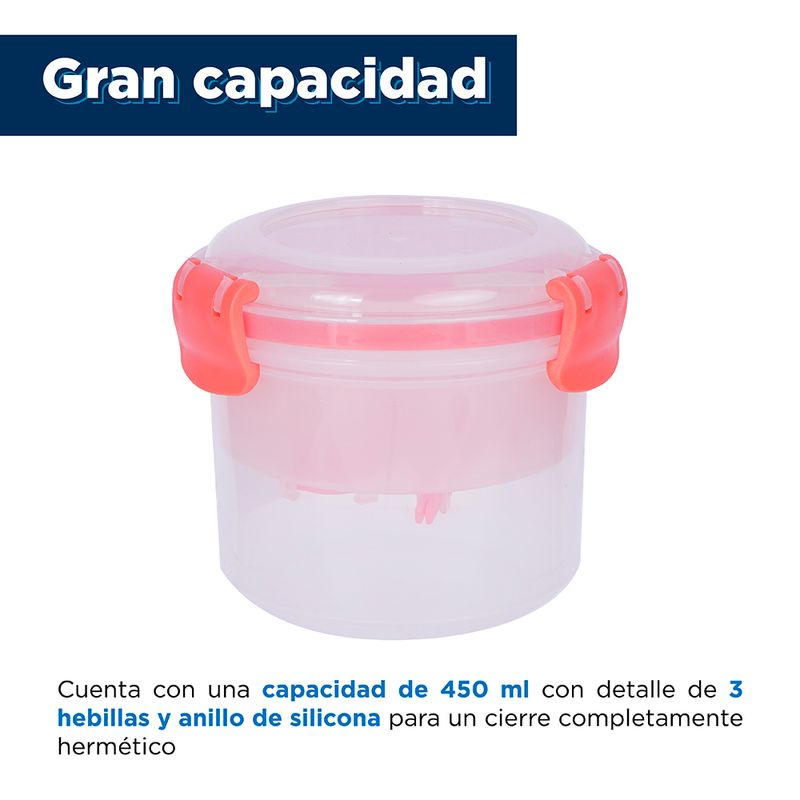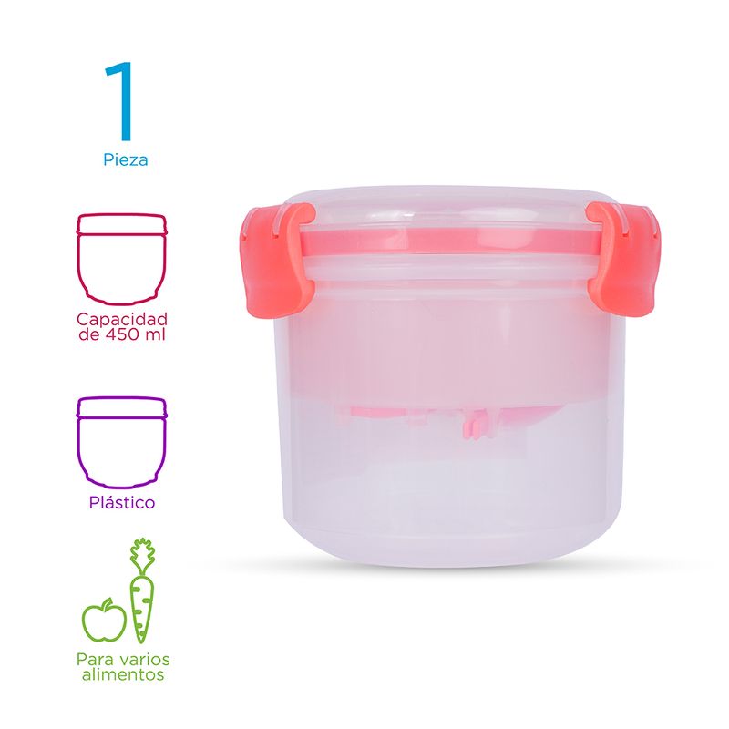 Olvídate de llevar o guardar comidas en recipientes desechables, tenemos para ti el Contenedor Para Ensalada Con Separación Naranja 450 ml, ideal para guardar y conservar en buen estado frutas o ensaladas. Contiene tapa y cierre hermético para evitar la salida o derrame de líquidos. Es práctico, ligero, seguro y con diseño moderno. Es la opción perfecta para llevar tu comida al trabajo o la escuela. |Multiusos: Comida caliente o frío, en este contenedor puedes guardar cualquier tipo de alimento, es apto para meterlo en microondas, dentro del congelador y además puede lavarse en lavaplatos. |Práctico: Guardar tus alimentos dentro de este contenedor es fácil y rápido. Es un recipiente ligero, ideal para almacenar aperitivos, comidas o refrigerios listos para llevar a la escuela o al trabajo. |Seguro: Tus alimentos estarán seguros en este contenedor gracias a su tapa con sello de silicona y cierre hermético, que bloquea la salida de alimentos y evita fugas, goteos o derrames indeseados. |Regalo ideal: Este contenedor cuenta con diseño sofisticado lo que lo hace un obsequio excelente cuando se trata de sorprender a esa persona especial. Dale un presente que ponga una sonrisa en el rostro de quien lo reciba. Instrucciones de uso:
