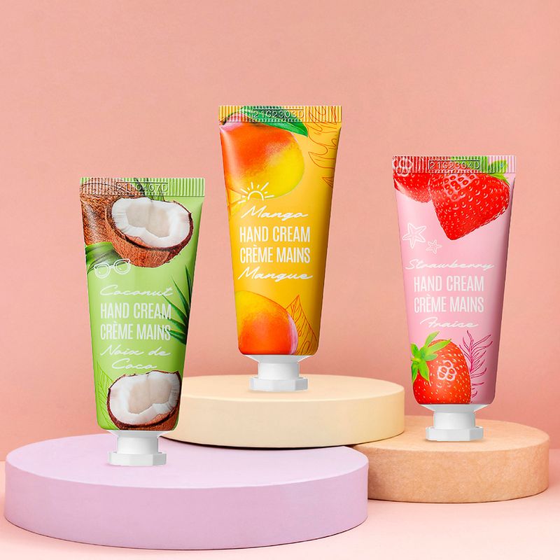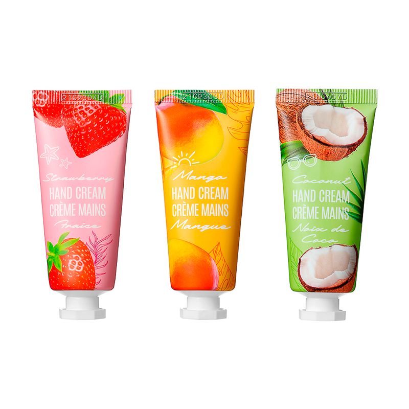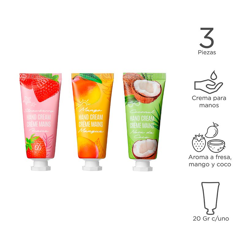 Adquiere este set de cremas para manos "Fresh Fruit Energy". | Contiene 3 cremas. | Cada una contiene extractos naturales de mango, coco y fresa. | Contienen 20 gr. | Dale un masaje a tus manos después de cada aplicación para que el producto penetre. Certificado INVIMA: