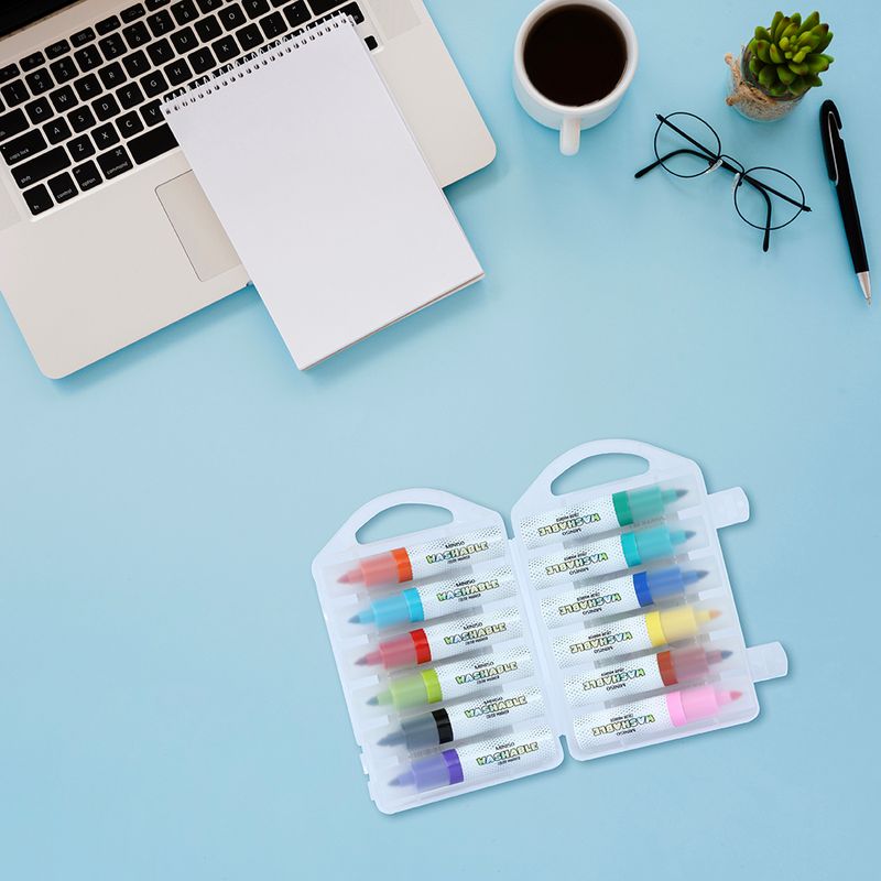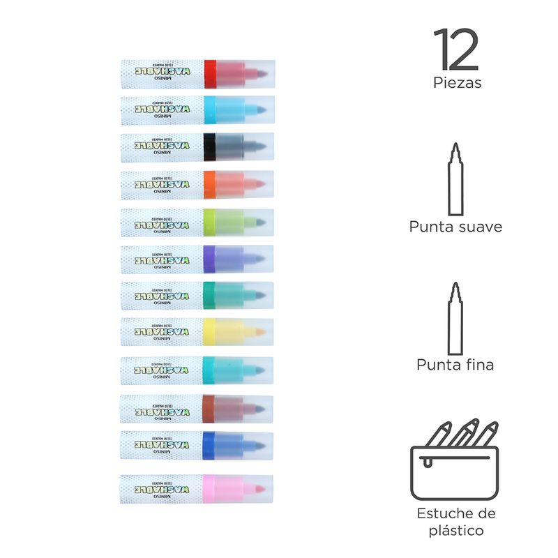 Set De Plumones, 12 Pzas Set de plumones multicolor. | Son lavables por lo que puedes usarlos en diferentes superficies. | Puntas delgadas que te brindan precisión. | Tamaño ancho para un buen agarre. | Vienen en un practico estuche de plástico. Modo de uso: Usar para escribir. Precauciones: Mantener con la tapa para evitar deterioro. Mantener alejado del fuego, mantener alejado de la humedad. No morder. Los niños lo deben usar bajo supervisión de un adulto.