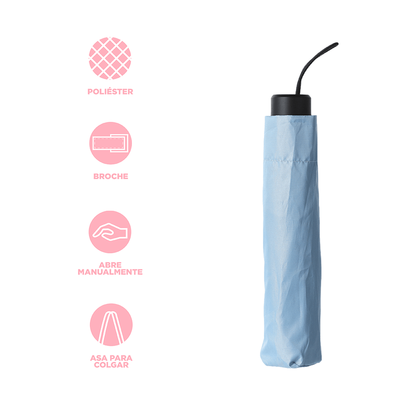 Miniso tiene para ti este practico paraguas ¡El complemento que no debe de faltar en tu hogar! | Confeccionado en poliéster de alta resistencia y durabilidad con varillas de hierro que no se oxidan fácilmente, su mango te ofrece un cómodo agarre, es fácil de operar con una sola mano, se abre de manera manual. | Estructura ligera y fácil de llevar, guárdalo en tu coche, maletín, mochila, bolsa de viaje, etc. Es perfecto para viajes, camping y uso diario. Incluye funda. | Tamaño 53.5 cm ¡Llévalo contigo a done quiera que vayas! | ¡En Miniso siempre encontraras los mejores accesorios para protegerte de los días de lluvia!. Modo de uso: Desplegar y utilizar. Plegar después del uso.