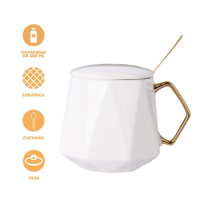 Taza de Ceramica con Asa Tapa y Cuchara 360 Ml Blanca