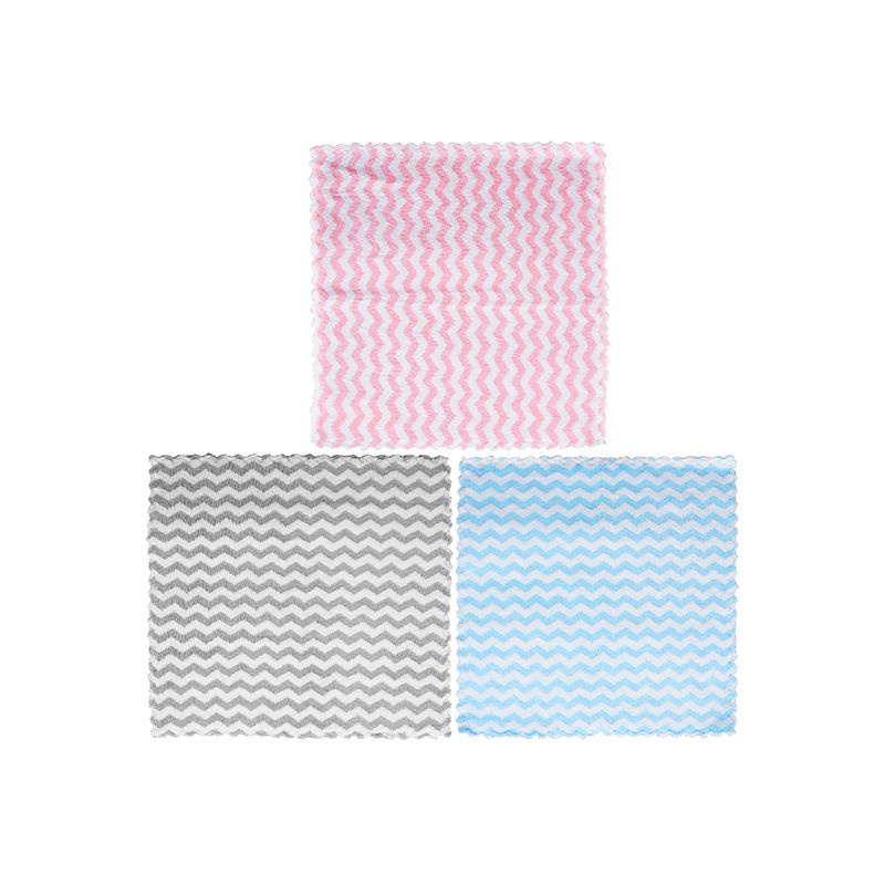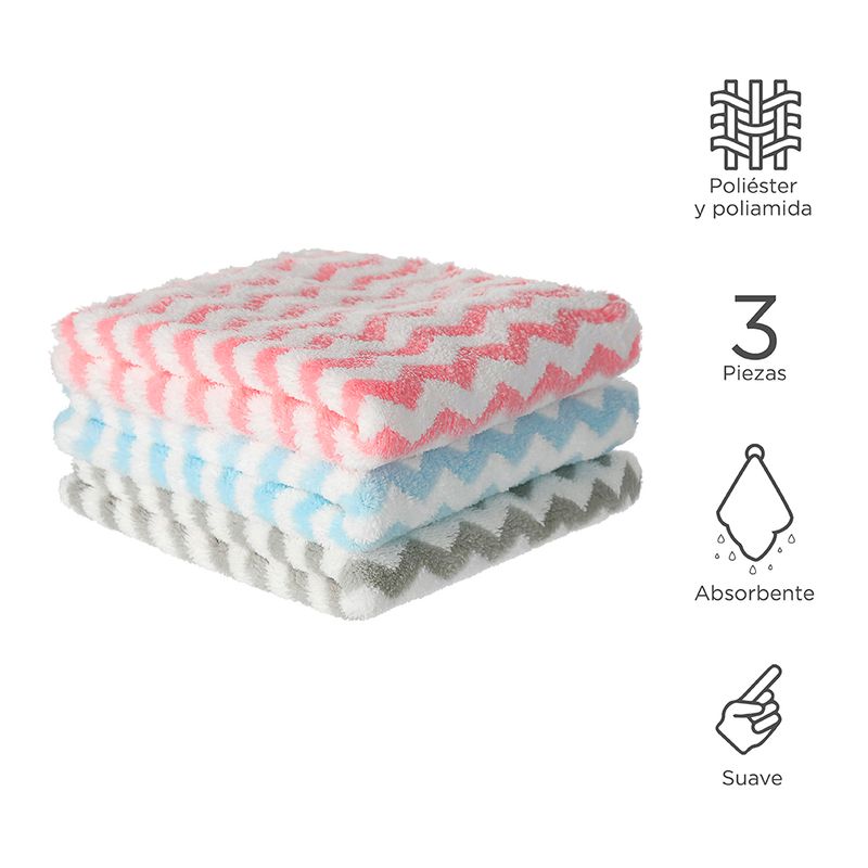 Miniso tiene para ti este set de paños de limpieza. | Confeccionados en tejido de punto con detalle de líneas a contraste. | Contiene 3 paños en color; azul, gris y rosa. | Tamaño 30x30 cm. | Perfectos para limpiar superficies, objetos, televisiones y gran variedad de artículos sin rayarlos gracias a sus materiales y textura suave. Modo de uso: Extienda el producto y aplique productos de limpieza o desengrasantes y proceda a retirar la grasa o suciedad de la superficies deseadas y luego enjuague con agua. Precauciones: Mantener en un lugar limpio, seco y alejado del fuego. Los niños lo deben usar bajo la supervisión de un adulto.