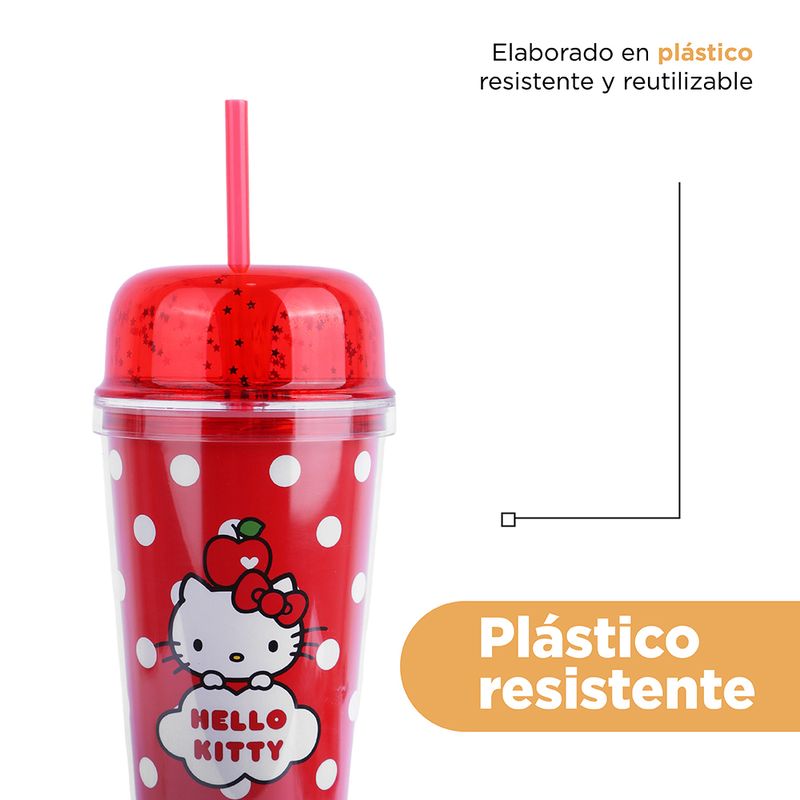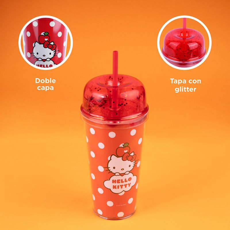 Botella de plástico con Pitillo de doble capa Hello Kitty Apple Collection 480 ml. Instrucciones de uso: Abra el producto y antes del primer uso lave con jabón neutro. Vierta la bebida a almacenar y cierre. Precauciones y advertencias: No apto para uso en lavavajillas, microondas o horno. No lo utilice para almacenar o transportar bebidas carbonatadas. Para minimizar el crecimiento bacteriano, no lo utilice para mantener calientes productos lácteos o alimentos para bebés. No lo utilices para contener agua con gas o líquidos corrosivos. Guardar en lugar fresco y seco. No esterilizar con agua hirviendo o vapor. Los niños lo bene usar bajo supervisión de un adulto.
